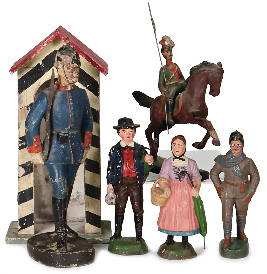 Soldat mit Pickelhaube, 18 cm, Masse, 1. Weltkrieg, 1 Soldat zu Pferd, wohl Pfeiffer, 12,5 cm, 1 Bein beschädigt, Fliegerfigur, ungem., Masse, 10,5 cm, ELASTOLIN, Magd, ELASTOLIN, Herr mit Schirm, gr. Wärterhaus