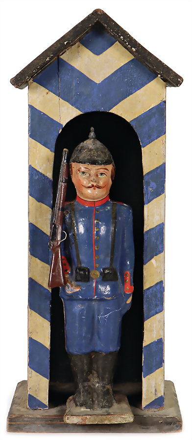 Papiermaché, 1. Weltkrieg, Soldat mit Pickelhaube, H: 20,5 cm, Papiermaché, auf Holzsockel, mit Gewehr, mit Wärterhaus, 30,5 cm