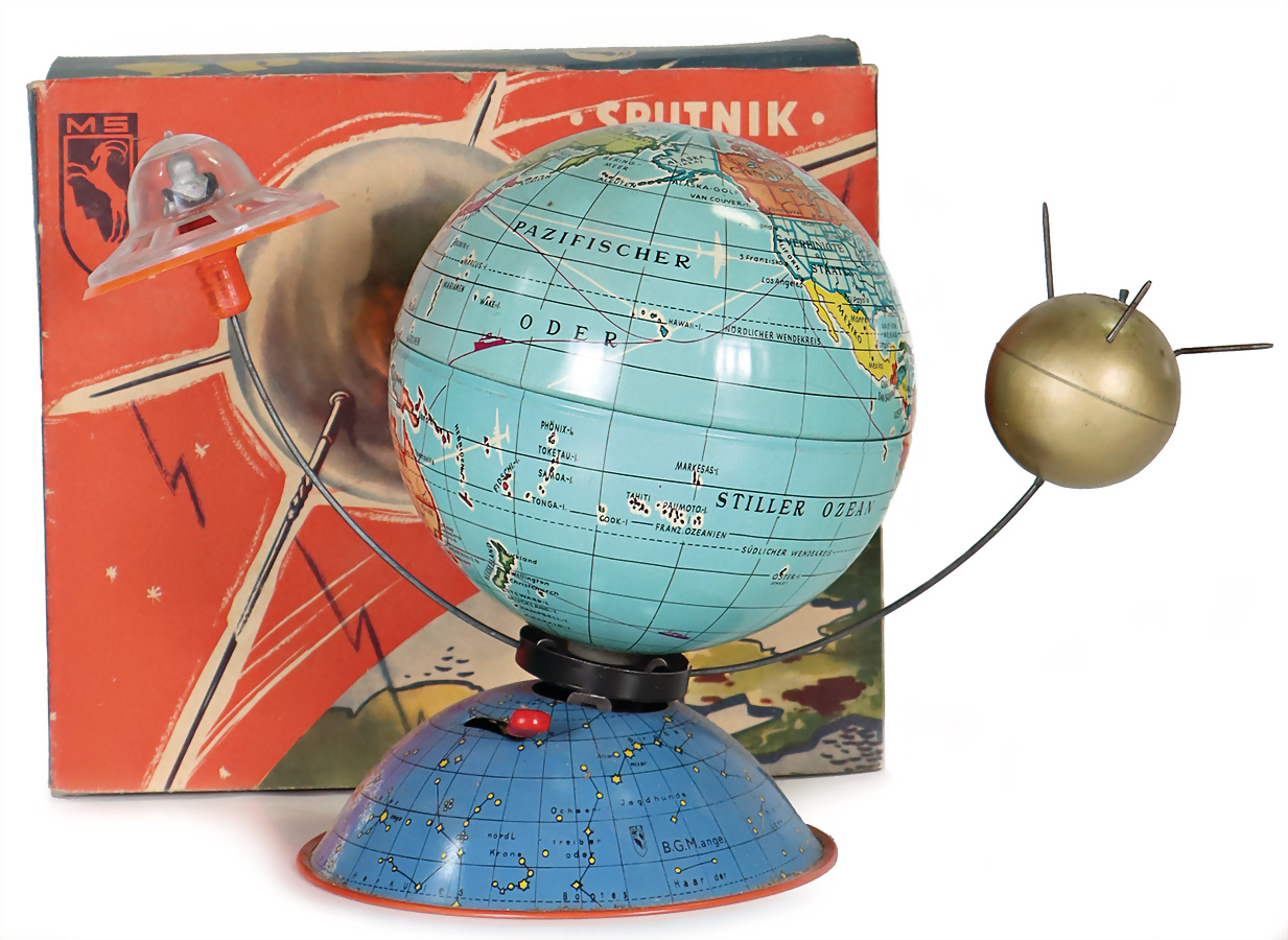 MS Sputnik 2000, Globus mit Satellit, Blech, lithogr., Kunststoffteile, im Orig.-Kart.