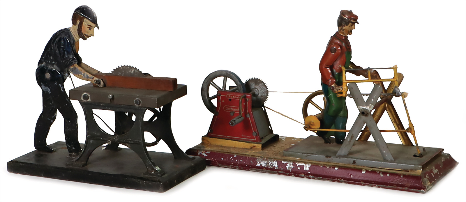 Antriebsmodell, 2 Teile, Mann an der Säge, Schwungradantrieb, wohl HESS, Figur, Blech, lithogr., bespielt, Lackfehler am Boden, flache Figur, Metallguss, an der Säge, auf Holzbrett montiert, 15 cm, Zust. gut