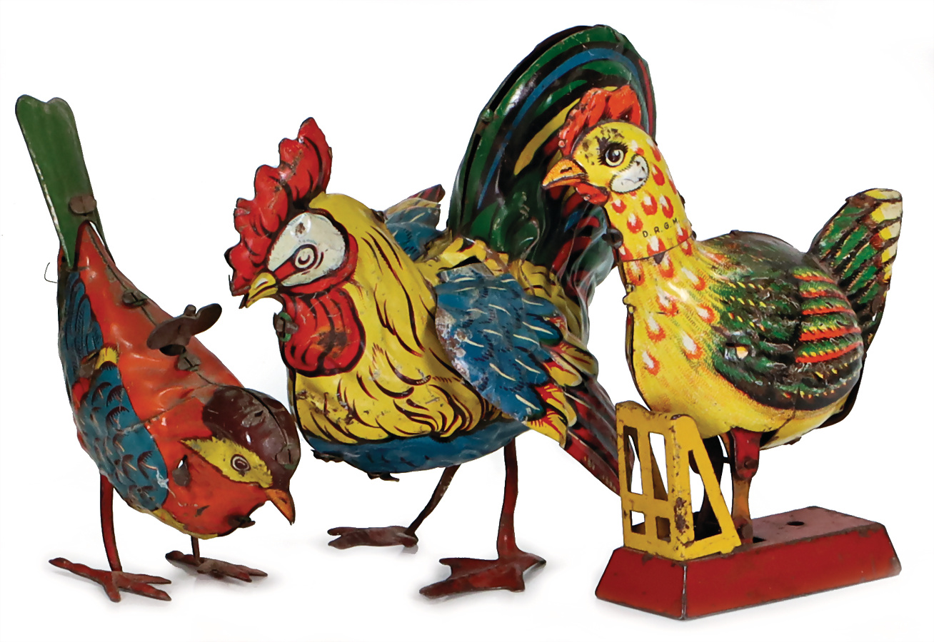 3 Teile, Federvieh, eierlegendes Huhn, Blech, lithogr., 11,5 cm, Funktion defekt, deutsch, Vorkrieg, Johann, ANDREAS ISSMAYER, Blech, lithogr., hüpfend mit Flügelschlag, Uhrwerk defekt, 1 Flügel etw. locker, Litho gut, 1 Vogel, Blech, lithogr., Vorkrieg, H: 8 cm, Uhrwerk intakt, bespielt