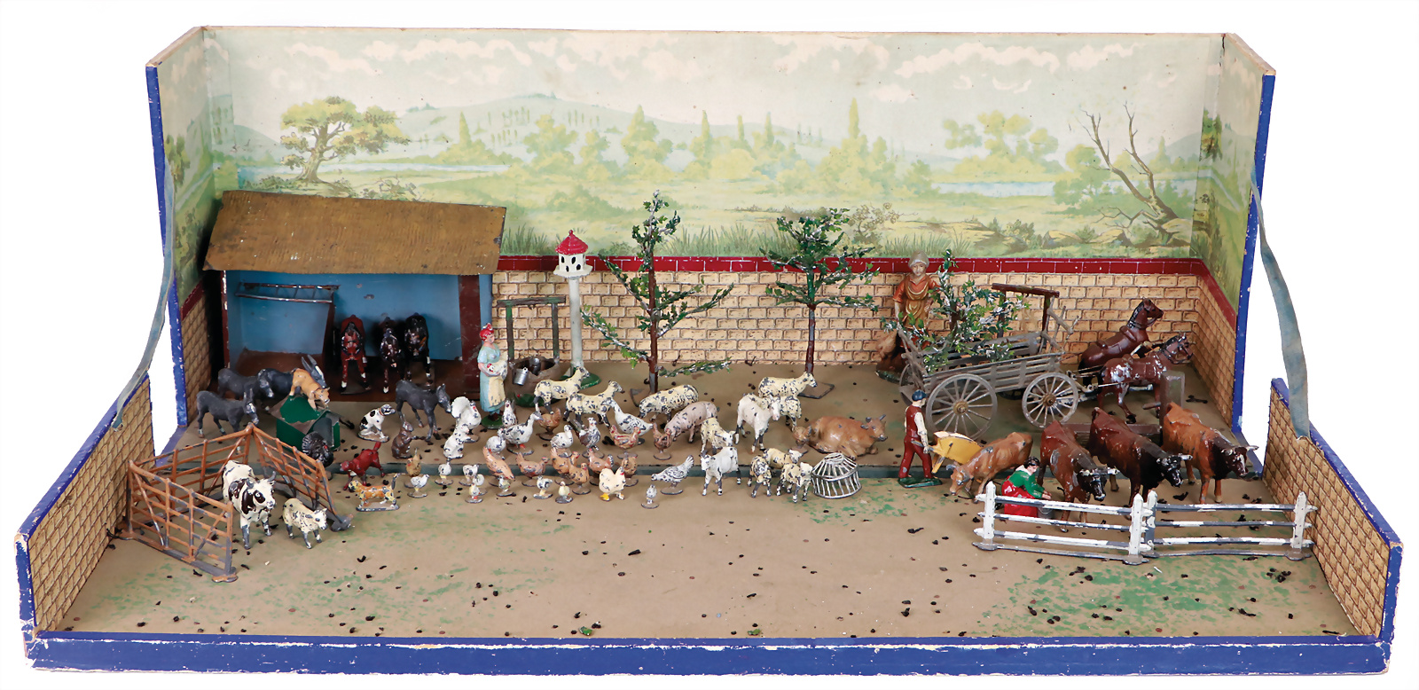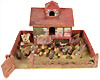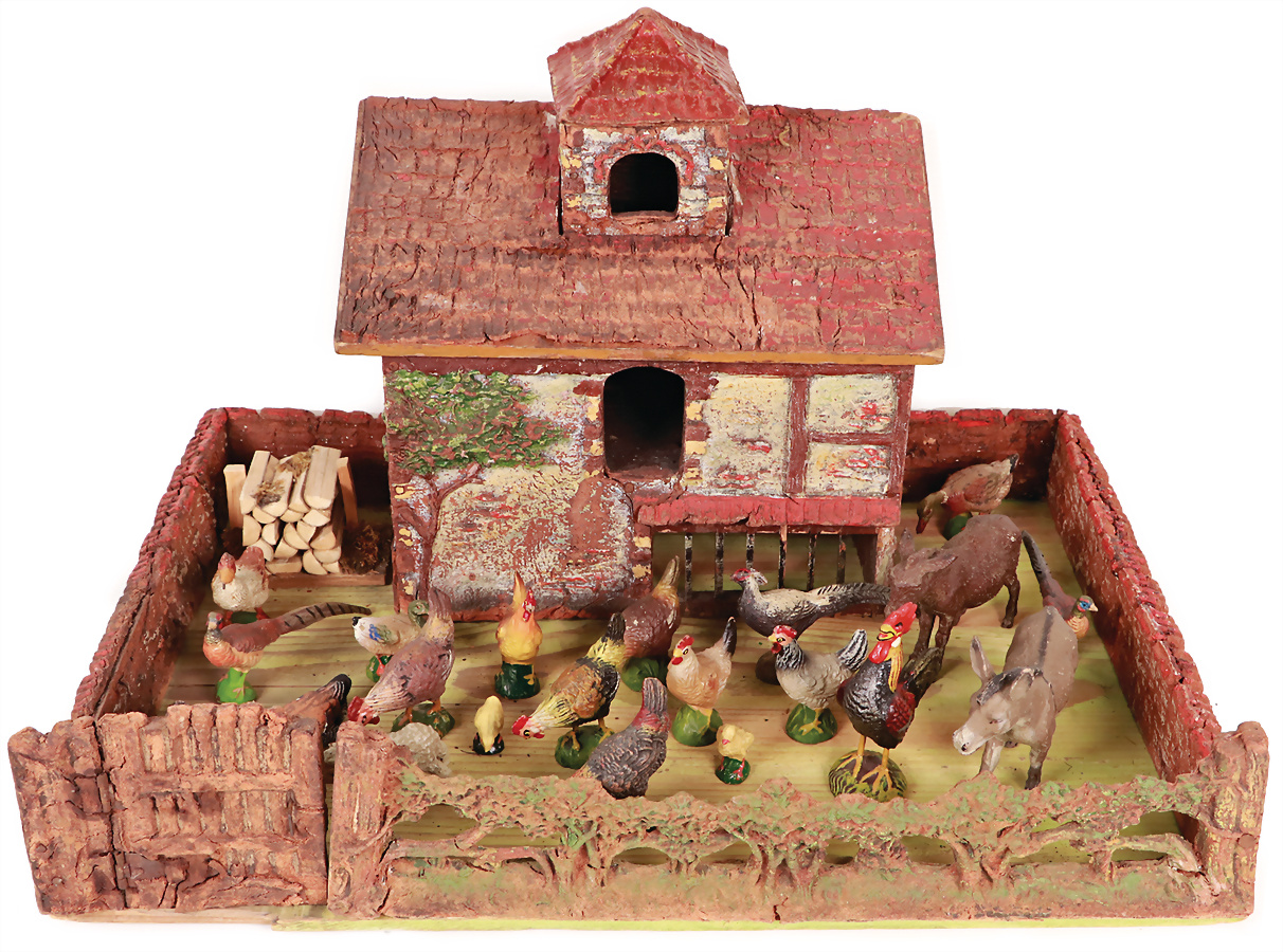 Diorama, mit Zinn- u. Metallgussteilen, Bauernhof, ca. 1910, B: 65 cm, H: 22 cm, T: 23 cm, Dach u. Rückwand aufklappbar, Innenteile teilw. Fehlstellen, dekorativ, das Objekt befindet sich in der Schweiz, bei Einfuhr in die EU fallen Einfuhrumsatzsteuer u. Zollgebühren an