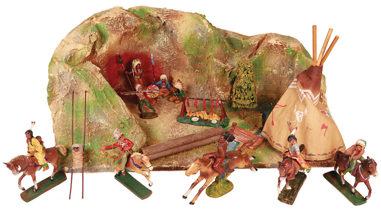 Grotte mit Bachlauf, B: 55 cm, H: 21 cm, Indianer, 7-7,5 cm, Häuptling LINEOL, Lagerfeuer, Tipi, meist Zust. 2, Squaw mit 2 Kindern auf Pferd, das Objekt befindet sich in der Schweiz, diese Artikel können abgeholt oder versandt werden, bei Einfuhr in die EU fallen Zoll u. Umsatzsteuer an, eine Verzollung kann auch persönlich vorgenommen werden, für Bieter außerhalb der EU gelten die dort üblichen Zollbedingungen