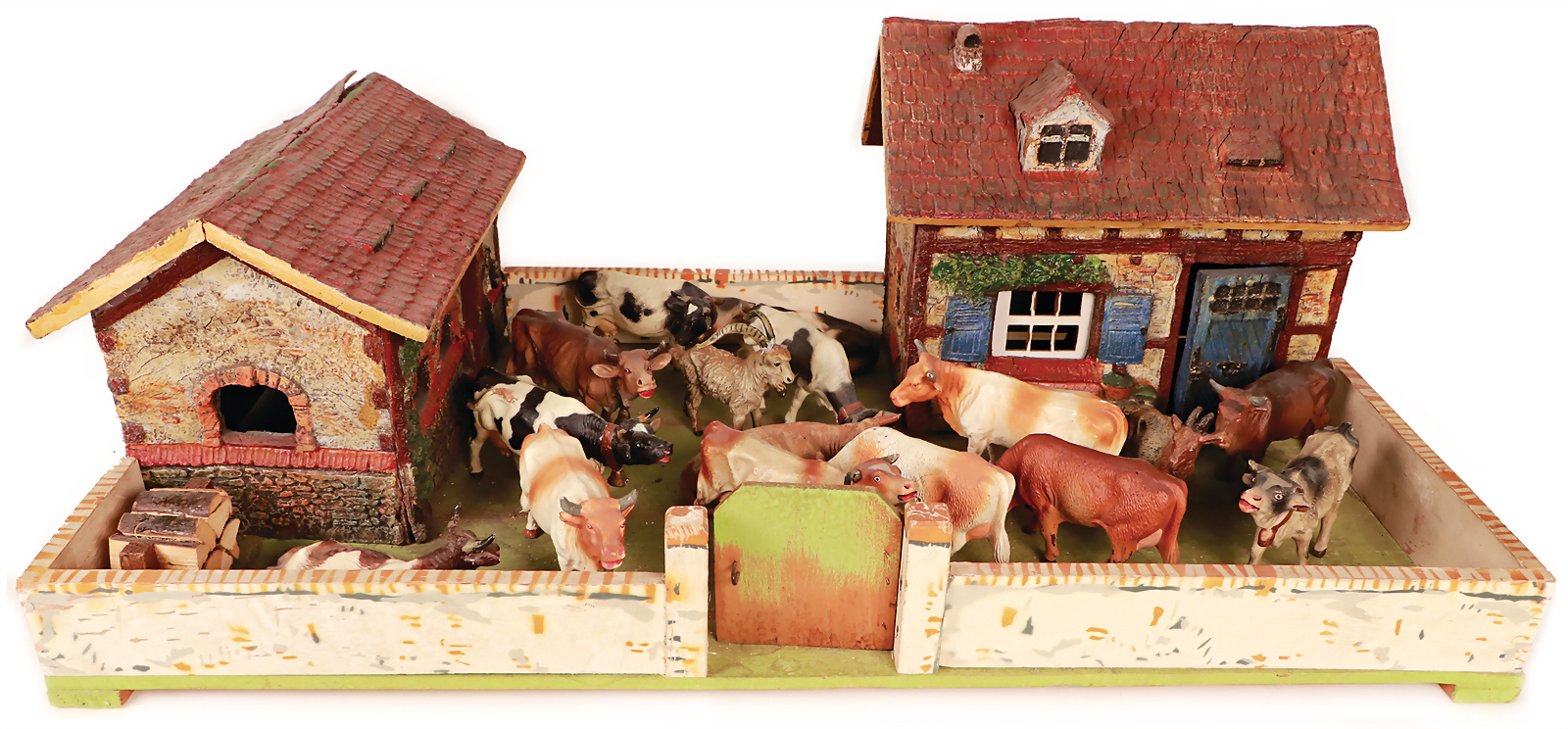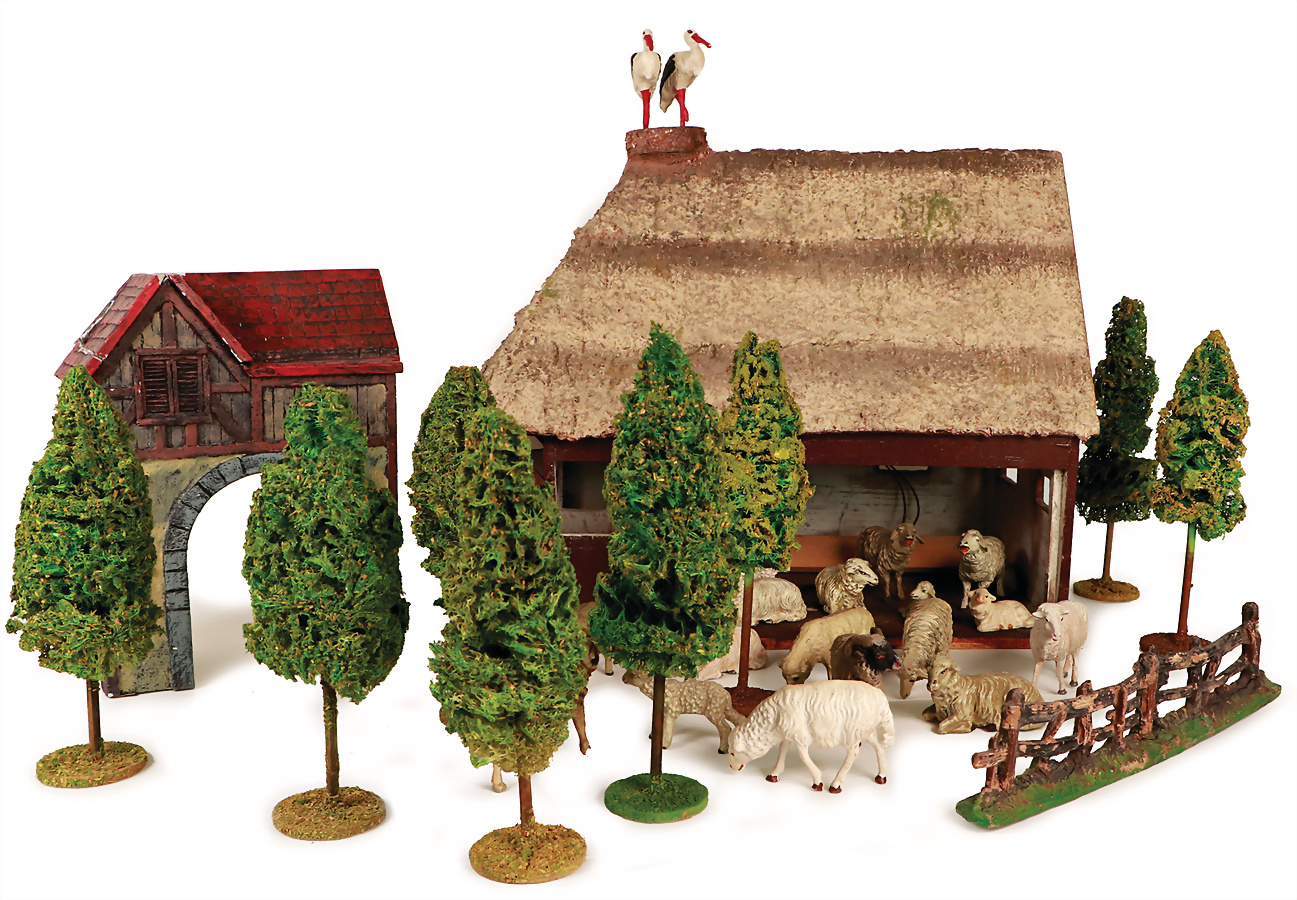 Stall, Holz/Masse, wohl Eigenbau, B: 37 cm, H: 33 cm, meist ELASTOLIN, Masse Schafe, Zaunteil, Luffabäume, 1 Gebäude mit Tor, Masse, Eigenbau, das Objekt befindet sich in der Schweiz, diese Artikel können abgeholt oder versandt werden, bei Einfuhr in die EU fallen Zoll u. Umsatzsteuer an, eine Verzollung kann auch persönlich vorgenommen werden, für Bieter außerhalb der EU gelten die dort üblichen Zollbedingungen