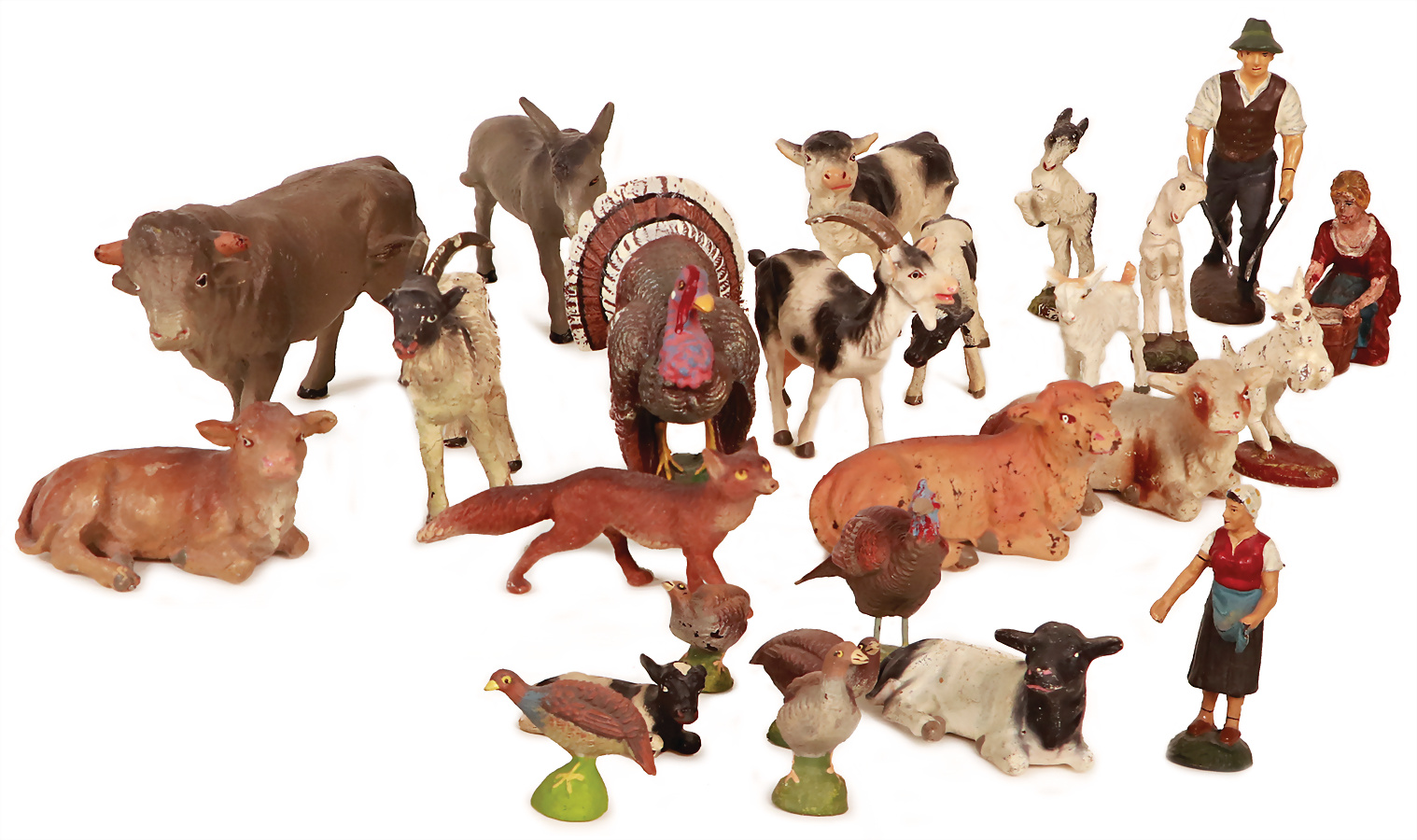 Konv. Bauernhoffiguren, Masse, Kühe, Ziegen, Esel, Federvieh, Gänsemagd, LINEOL, 8,4 cm, Magd mit Trog, Bauer nicht kompl., sonst meist Zust. 2, das Objekt befindet sich in der Schweiz, diese Artikel können abgeholt oder versandt werden, bei Einfuhr in die EU fallen Zoll u. Umsatzsteuer an, eine Verzollung kann auch persönlich vorgenommen werden, für Bieter außerhalb der EU gelten die dort üblichen Zollbedingungen