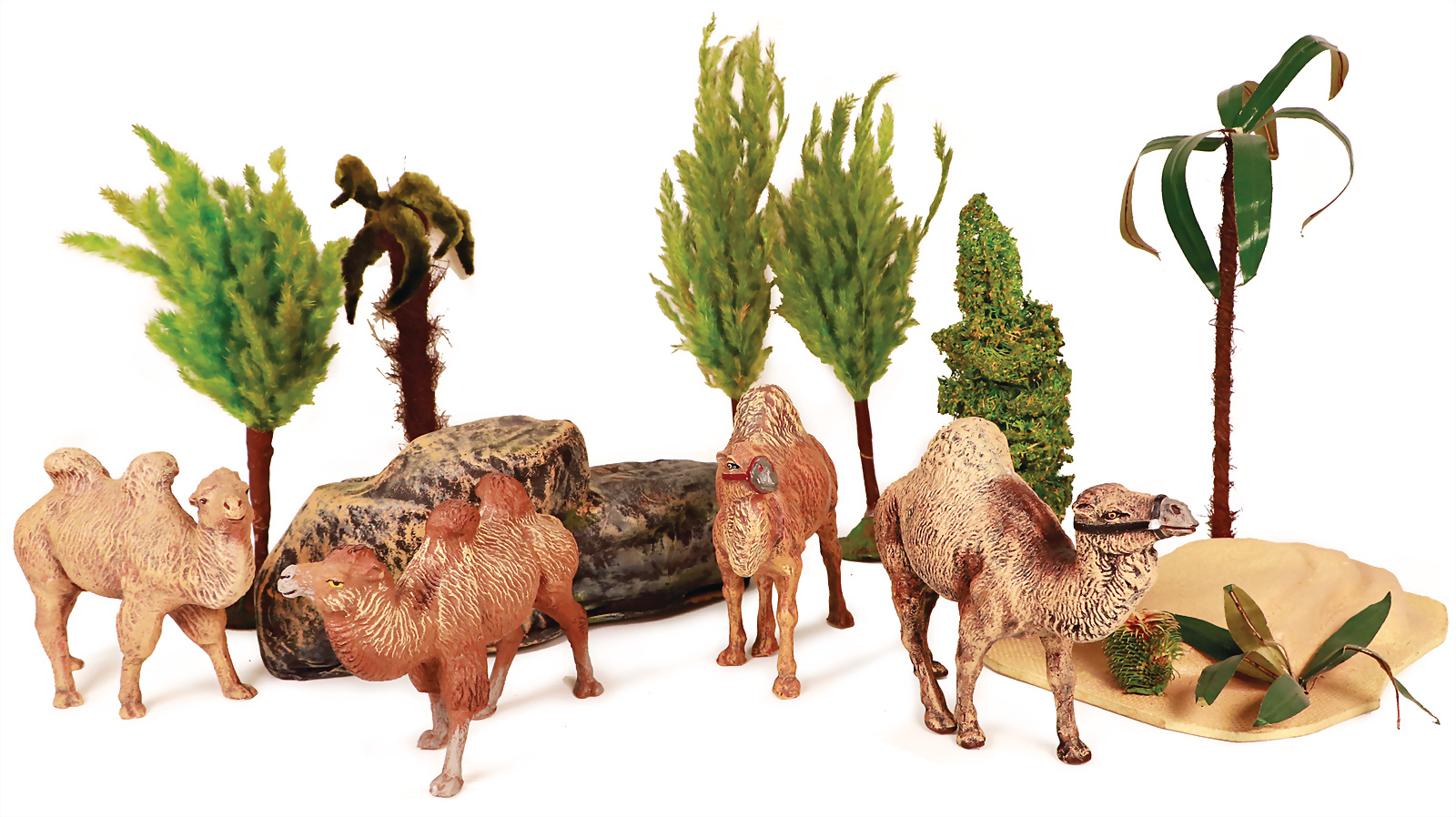 Wüstenszene, mit Palme, Berg, Luffabäume, einige Kamele Masse, meist ELASTOLIN, Zust. 1-2, das Objekt befindet sich in der Schweiz, diese Artikel können abgeholt oder versandt werden, bei Einfuhr in die EU fallen Zoll u. Umsatzsteuer an, eine Verzollung kann auch persönlich vorgenommen werden, für Bieter außerhalb der EU gelten die dort üblichen Zollbedingungen