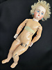 Seltenes herausragendes französisches Bébé mit wasserblauen Augen aus dem Hause Huret mit original Guttapercha-Körper und Porzellanhänden Biskuit-Porzellan-Kurbelkopf, fest eingesetzte mandelförmige wasserblaue Strahleniris-Augen, zarter Lidschatten, für Huret typisch markantes rundes Gesicht mit vollen Wangen, leicht fliehendem Kinn und Doppelkinn, schattierte Lippen und Außenkonturen, tief modelliertem Philtrum, durchstochene Ohrläppchen, original Huret-Guttapercha-Körper gem. des Huret Patents mit den typischen Verbindungen an Schultern, Ellbogen, Hüften und Knien, Porzellanhände mit separat modellierten Fingern, original blonde lockige Fellperücke auf originalem Korkdeckel, Ohrringe, schönes blaues originales Kleid mit Spitzenverzierungen, schöne Haube, antike Strümpfe und braune Lederschuhe, bestehend aus einer Jacke und einem Rock aus Wolle und Seide, sowie Original-Perücke aus Schaffell. Zustand: allgemein exzellent, sehr fragile Oberschenkelverbindung. Markierung: Huret 54 Boulv. Haussmann Paris (Lederband auf Torso): Huret, ca. 1880. Größe: 45 cm, das Objekt befindet sich im Schweizer Zolllager, für Bieter außerhalb der Schweiz muss ein Versand vorgenommen werden, bei Einfuhr in die EU fallen Zoll, Umsatzsteuer u. Bearbeitungsgebühren an, für Bieter außerhalb der EU gelten die dort üblichen Zollbedingungen