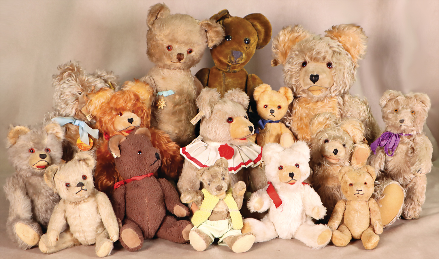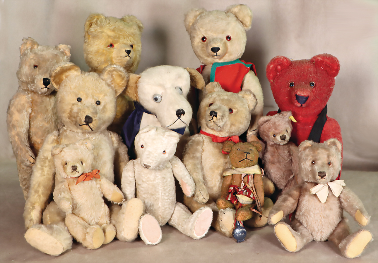 Konv. Bären, unterschiedliche Hersteller, Nachkrieg, darunter gr. STEIFF Zotty, 48 cm, ohne Knopf u. Schild, Zotty, 26 cm, goldener Knopf, Schild u. Fahne, kl. Zotty, stärker bespielt, "Spielzeugmuseum Graz"