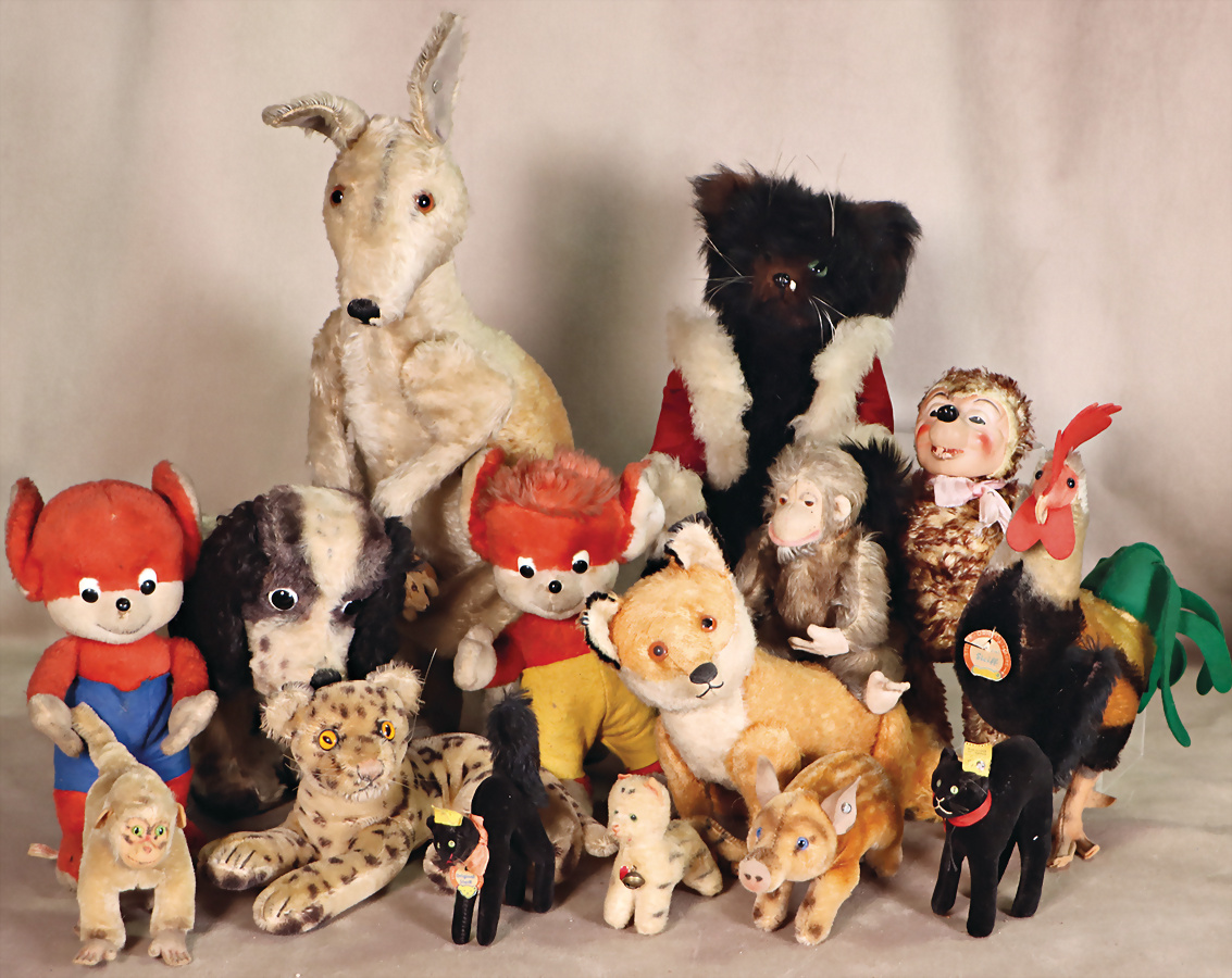 Konv. STEIFF u.a. Tiere, gr. Känguru, 50 cm, mit Kind, mit Knopf, ohne Schild u. Fahne, 2 Walt Disney Figuren, SCHUCO Biego Bello, "Spielzeugmuseum Graz"