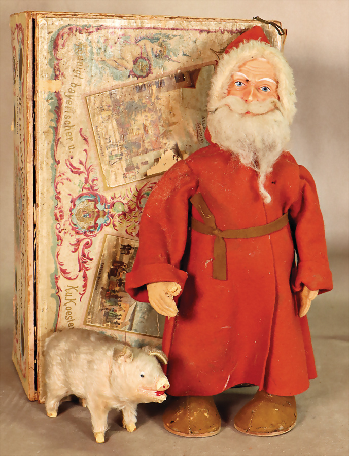 Weihnachtsmann, 37,5 cm, Celluloid-Kopf, seitl. eingerissen, Filzkleidung, altersbedingt Filzfehler, 1 Schwein, Candy-Container in alter Lebkuchendose, "Spielzeugmuseum Graz"