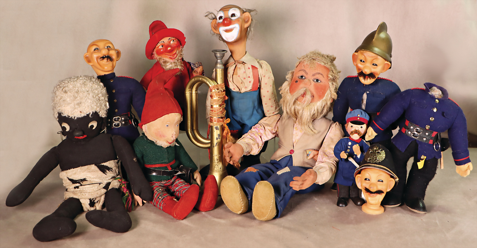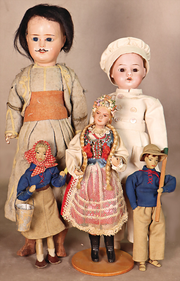 Konv. Puppen, ARMAND MARSEILLE, 1904, 31 cm, Kurbelkopf, braune fest einges. Glasaugen, off. Mund, einfacher Gliederkörper, ohne Perücke, Papiermaché-Puppe, 38 cm, fest einges. Glasaugen, einfacher Stehkörper, aufgemalter Schnurrbart, angezogen als Türke, 3 Künstlerpuppe, 19-24 cm, Stoff/Masse, Orig.-Kleidung, "Spielzeugmuseum Graz"
