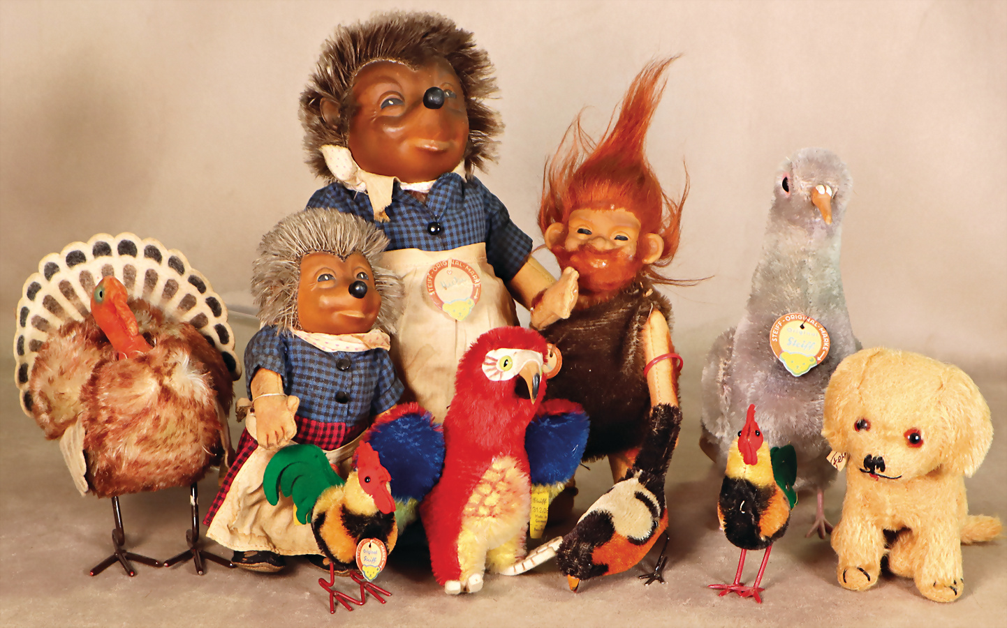 Nachkrieg, Taube, kompl. Nr. 2565/25, Truthahn, Knopf u. Fahne, Neandertaler, kompl., Nr. 7755/19, Papagei, Knopf u. Fahne, Nr. 1312.08, 2 Hähne, 1x kompl., 1x mit Schild, 2x Mickey mit Schild, 1 Hund, FECHTER, 1 Vogel, SCHUCO, "Spielzeugmuseum Graz"