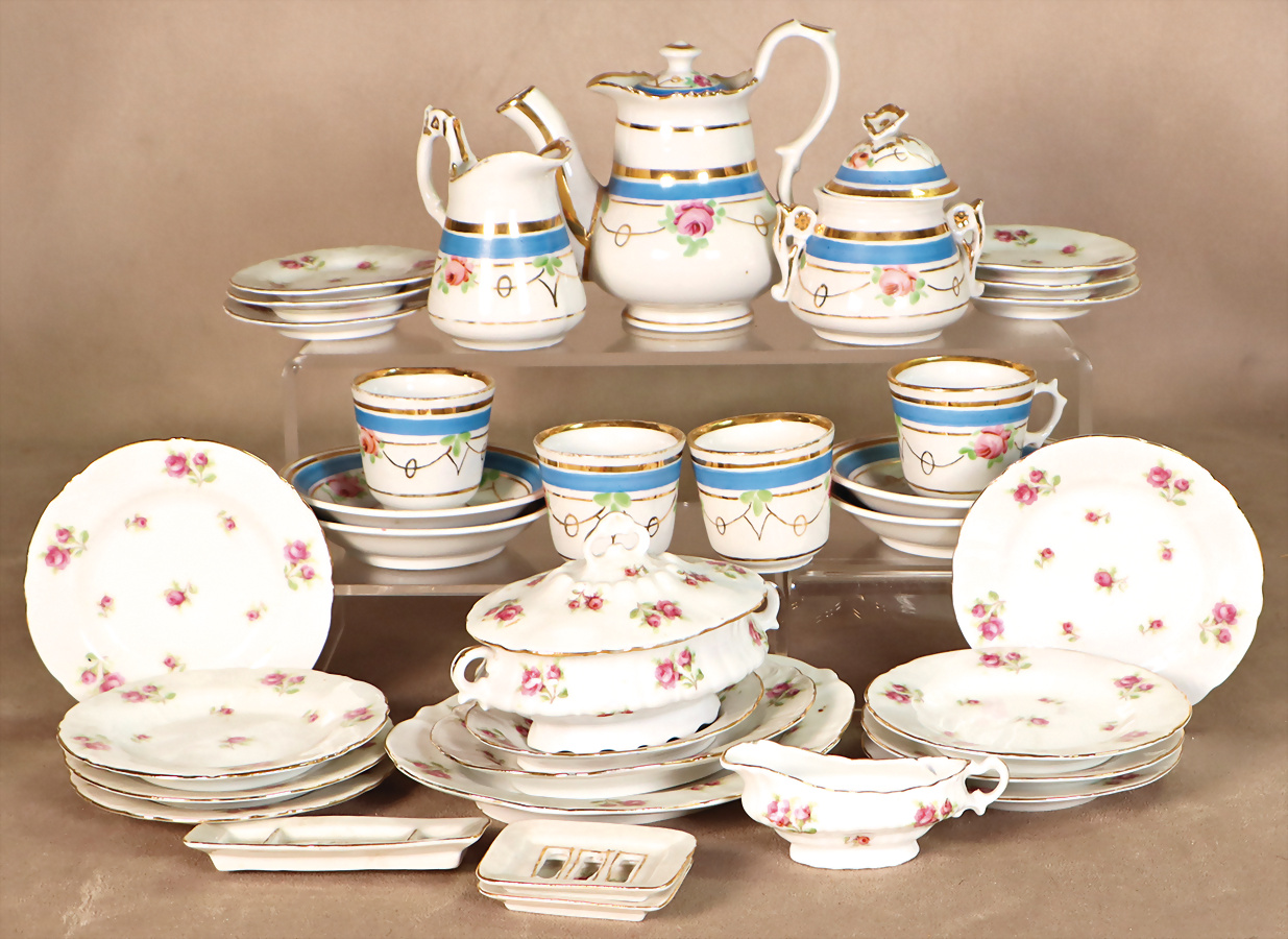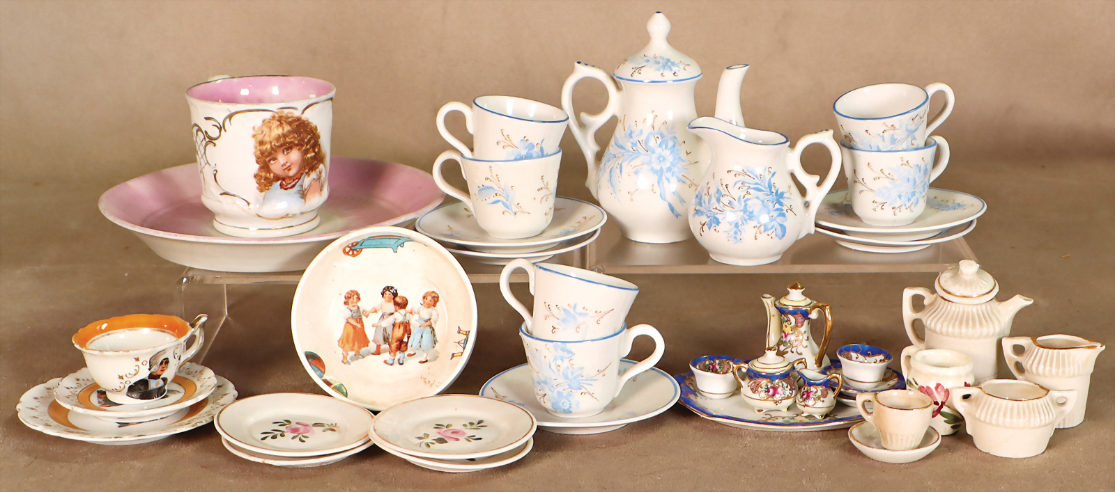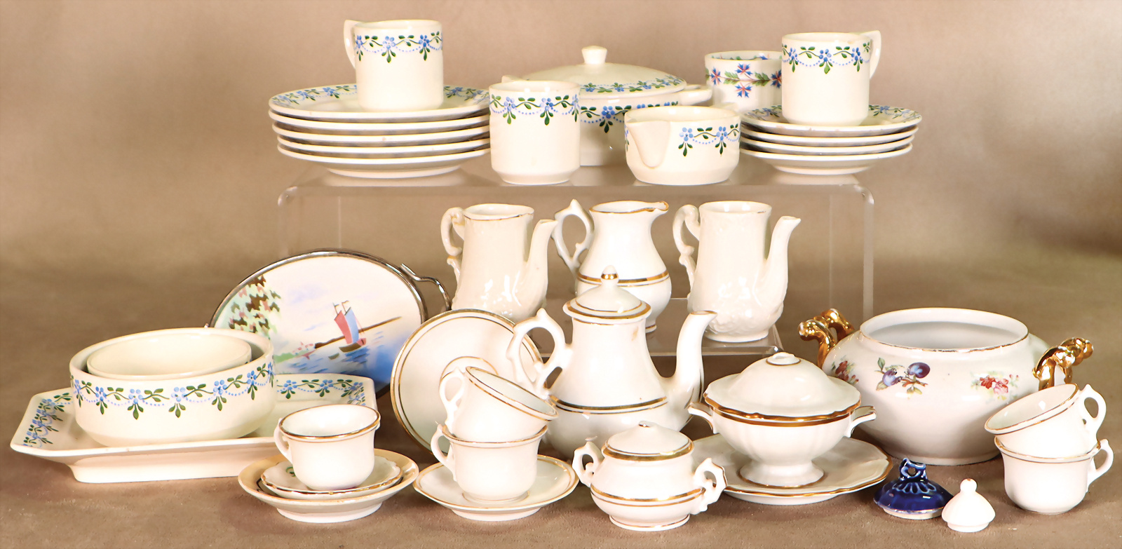 Konv. Porzellan- u. Keramik-Service-Teile, Speise-Service, Teller D: 11,5 cm, Porzellan-Kaffee-Service, teiwl. guter Zust., teils angestoßene Stellen , "Spielzeugmuseum Graz"
