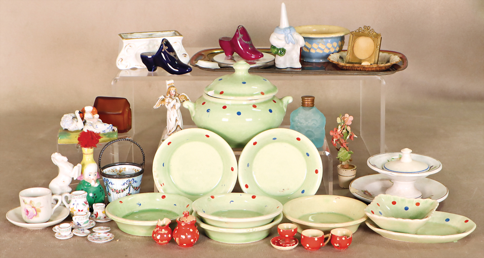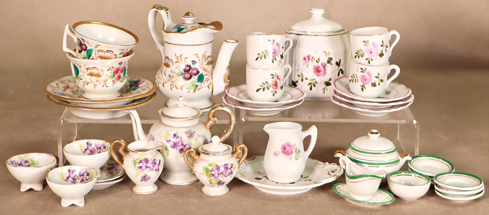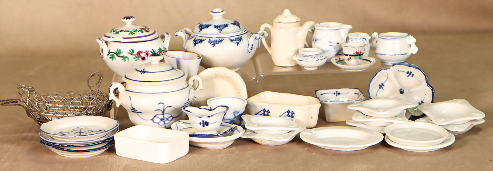Konv. Puppenstuben-Porzellan-Service-Teile, untersch. Programme, Vasen, meist guter Zust., teils kl. Stellen angeschlagen, "Spielzeugmuseum Graz"