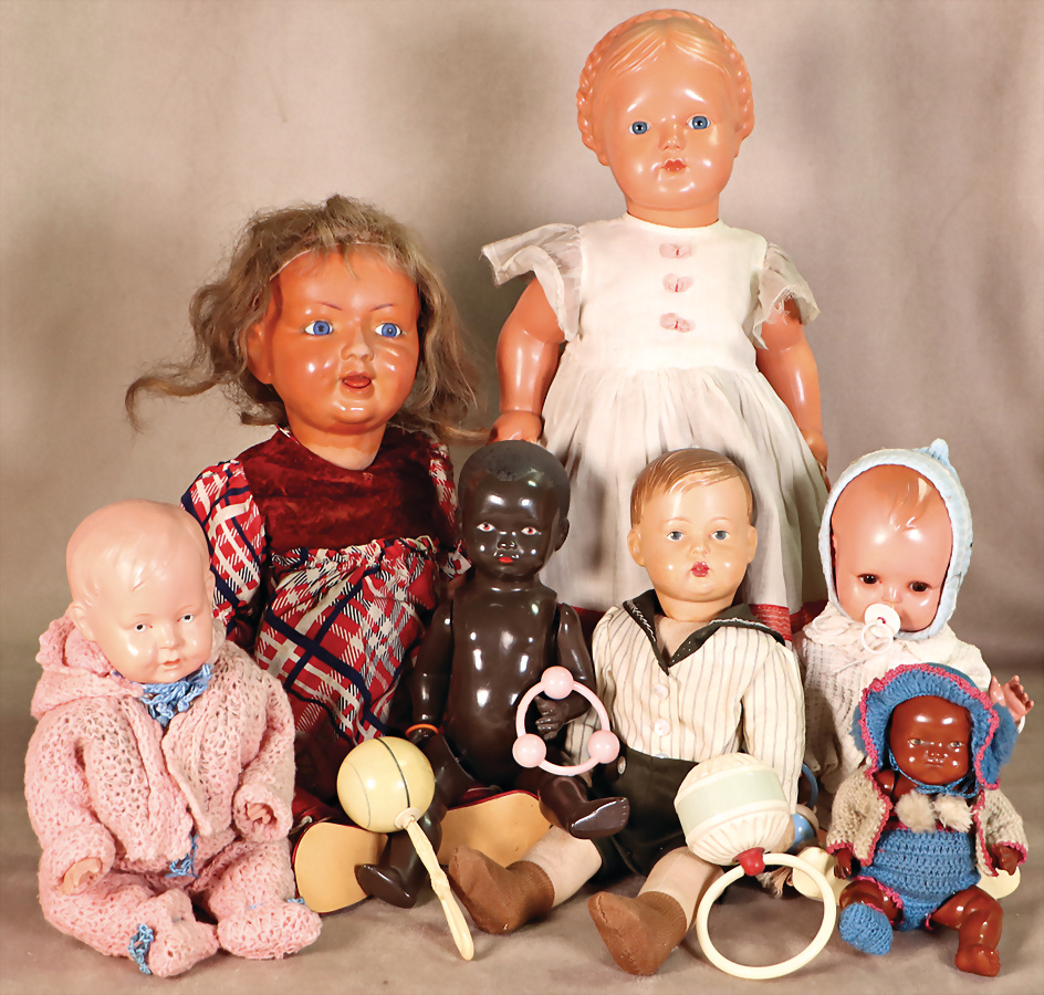 Konv. Puppen, Celluloid, ZELBA, Gretchen, 46 cm, Glasaugen, SCHILDKRÖT, Junge, MINERVA, Strampelchen, Junge, Celluloid-Kopf, Stoffkörper, SoR, Puppe, Celluloid, Glasaugen, später aufgesetzte Perücke, Nase ausgebessert, Gummis locker, kl. farbige Puppe, PAUL HUNEUS, kl. farbige Puppe, SCHILDKRÖT, Gummis locker, 2 Celluloid-Rasseln, bitte Transportrisiko für Celluloid beachten, "Spielzeugmuseum Graz"