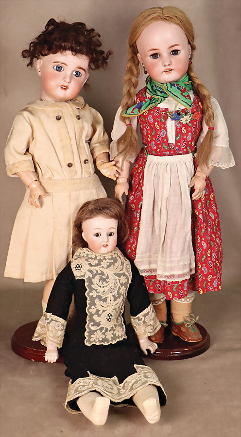 Konv. Puppen, SFBJ, Porzellankopf-Puppe, Frankreich, 44 cm, Kurbelkopf, blaue fest einges. Glasaugen, durchstochene Ohren, Kinngrübchen, Gliederkörper, HEUBACH im Quadrat, Porzellan-Brustblattkopf-Puppe, braune, nachträglich fest eingesetzte Glasaugen, seitl. blickend, offener Mund, einfacher Stoffkörper, Porzellan-Unterarme, SIMON & HALBIG, 1078, 49 cm, Kurbelkopf, blaue Schlafaugen, off. Mund, durchstochene Ohren, Gliederkörper, alte Kleidung u. Schuhe, "Spielzeugmuseum Graz"