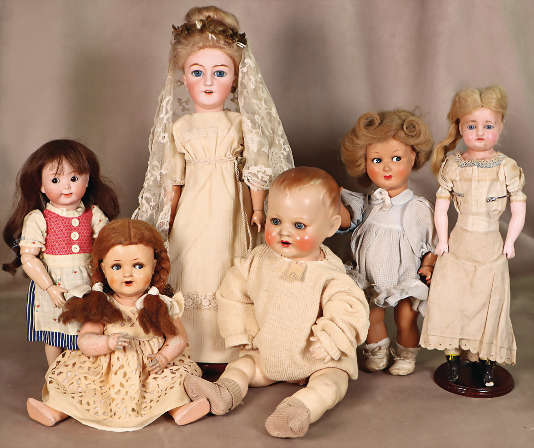 Konv. Puppen, KÖNIG & WERNICKE, Masse, 133, 33 cm, braune Schelmenaugen, off. Mund, oben Zähne, Masse-Baby-Körper, stärker bespielt, Puppe, Kunststoff, 36 cm, Masse-Einbindekopf-Baby, 45 cm, Gummis lose, Googly (Reproduktion), 34 cm, Wachs überzogene Papiermaché-Puppe, 41 cm, fest einges. blaue Glasaugen, Mohair-Perücke, Stoffkörper, Wachs überzogene Arme u. Beine, anmodell. Stiefel, SIMON & HALBIG, 1159 XI DEP, 46 cm, sehr gute Reproduktion, "Spielzeugmuseum Graz"