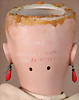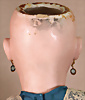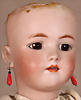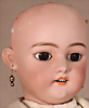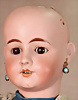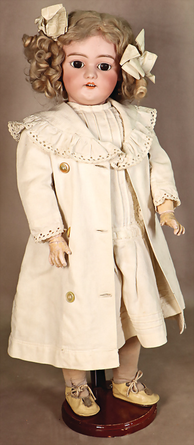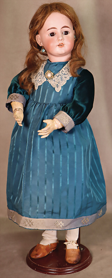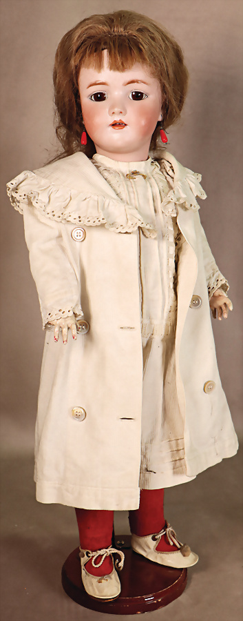 1079 DEP 10½, 56 cm, Kurbelkopf, braune Schlafaugen, off. Mund, oben Zähne, Kinngrübchen, durchstochene Ohren, Gliederkörper, Masse-Abplatzer an den Händen, alte Kleidung u. Schuhe, Mohair-Perücke, Gummis locker, "Spielzeugmuseum Graz"