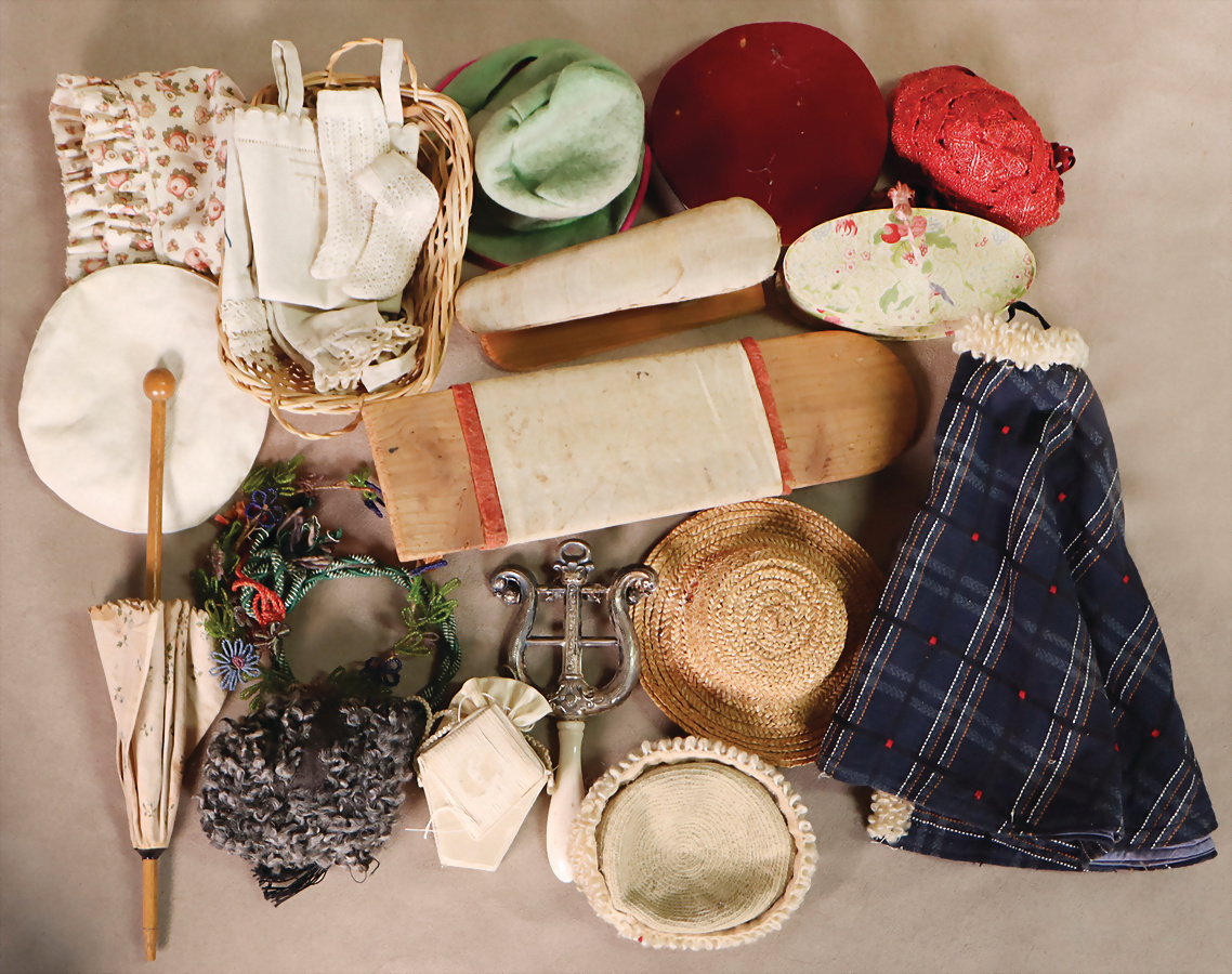Fundkiste, Puppenkleidung, Schirm, Hüte, Mantel, Schirm, Candy-Container, außergewöhnliche Silberrassel, 18,5 cm, 2 Bügelbretter, "Spielzeugmuseum Graz"