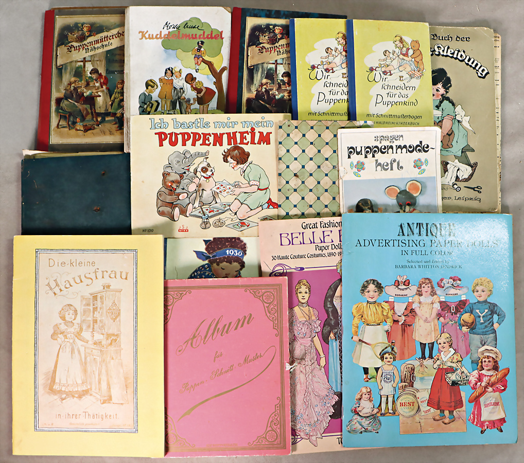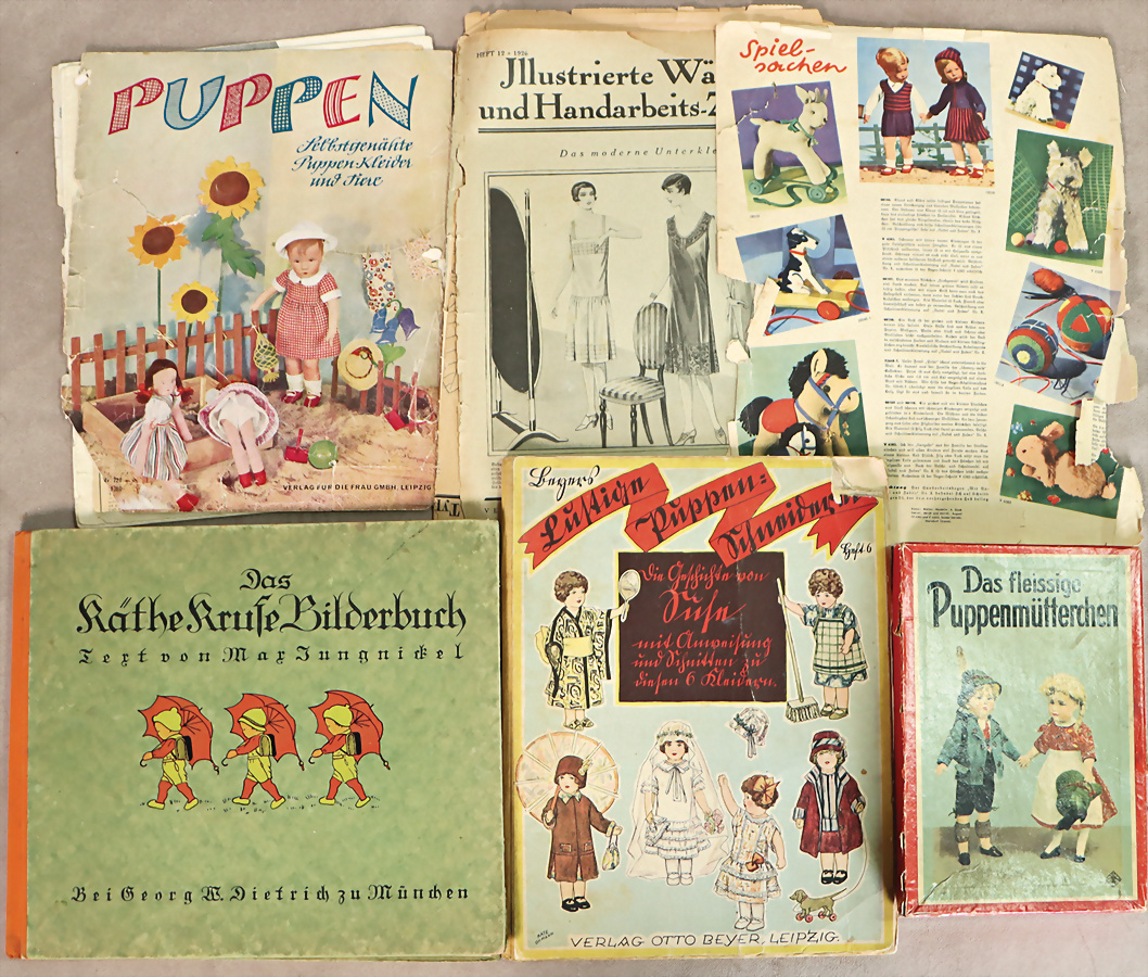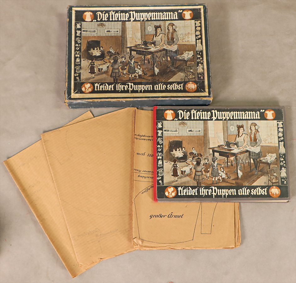 Bilderbuch von Georg W. Dietrich zu München, viele, schöne, bunt illustrierte Abbildungen der Puppe Nr. I, 1 Seite kl. Einriss, sonst Zust.2, einige Schnittmuster, „Das fleißige Puppenmütterchen“, Schnittmuster u. Abbildungen, im Orig.-Kart., "Spielzeugmuseum Graz"