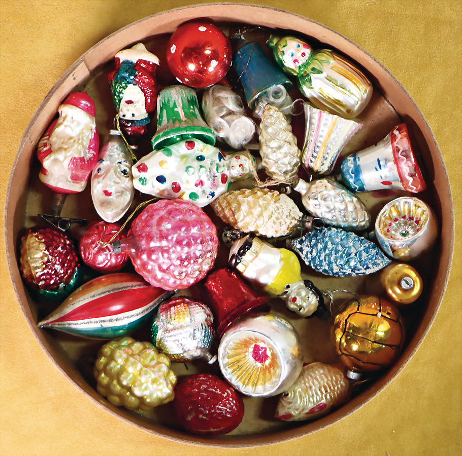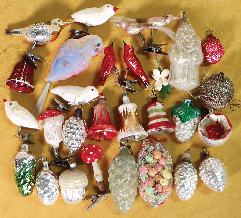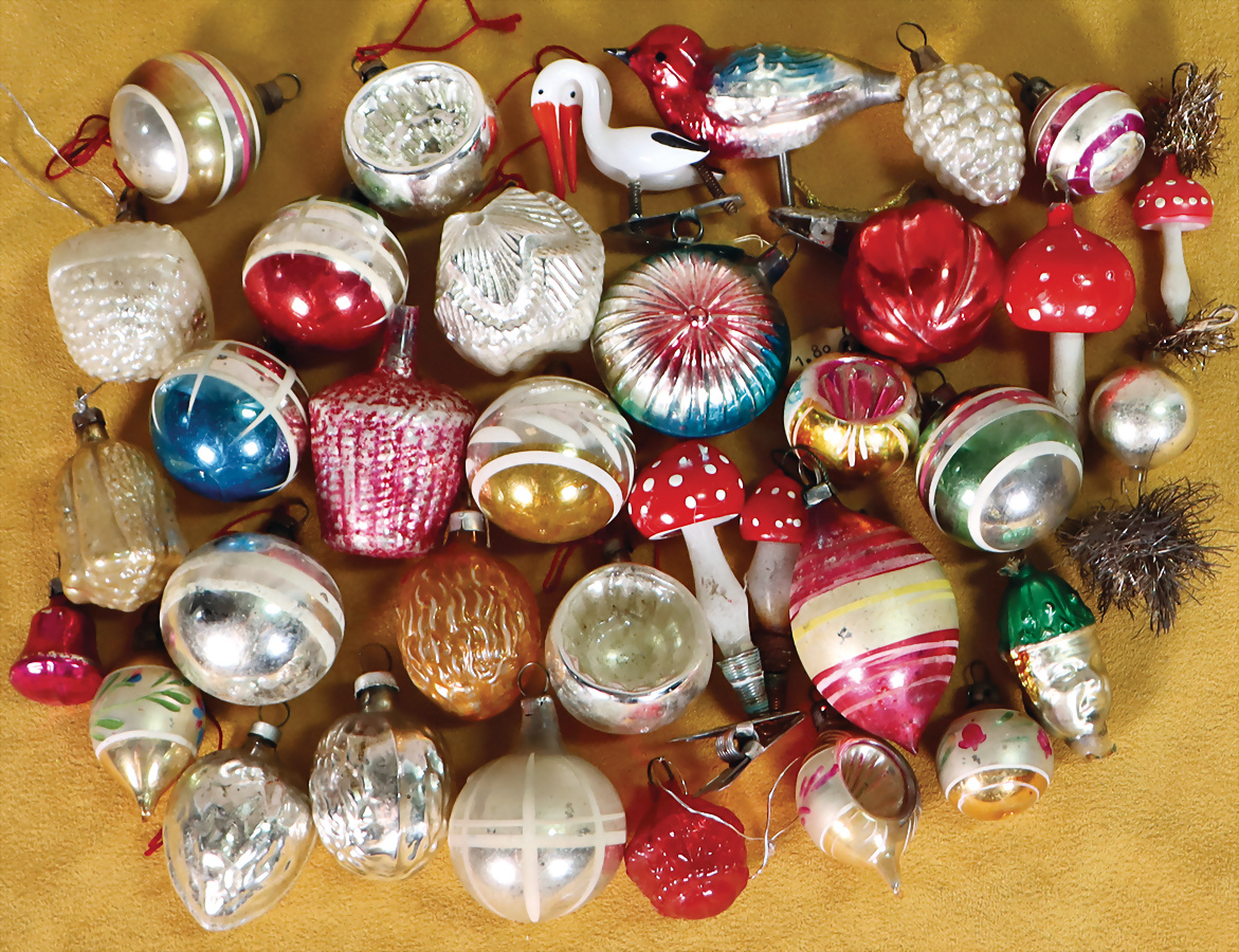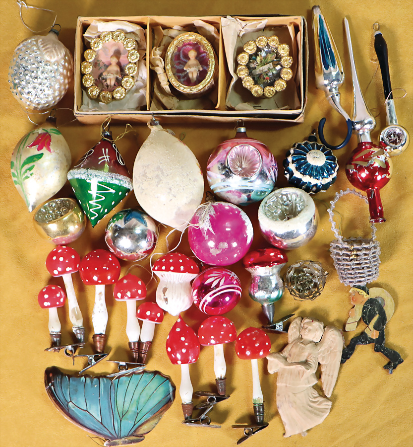 Konv. Christbaumschmuck, Glas, Weihnachtsmann, Glas, Christbaumkugeln, Reflektorkugeln, Vögel, Pilz mit Klammer, kl. u. mittlere Gr., "Spielzeugmuseum Graz"