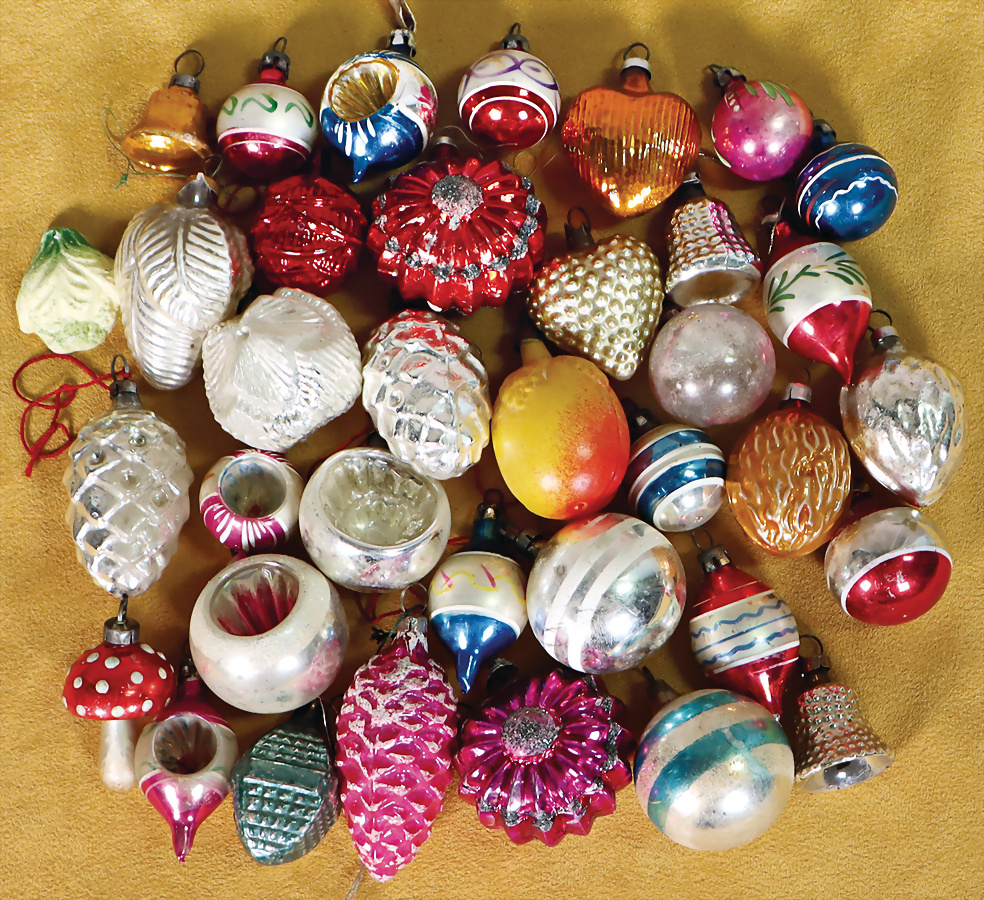 Christbaumschmuck, Glas, kl. u. mittlere Größen, ca. 30 Teilen, Zapfen, Nüsse, Pilz, Reflektorkugeln, Glocke, meist guter Zust., "Spielzeugmuseum Graz"