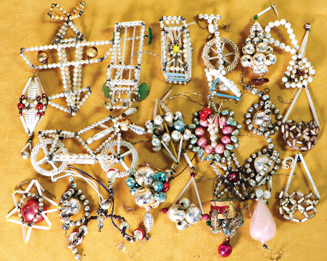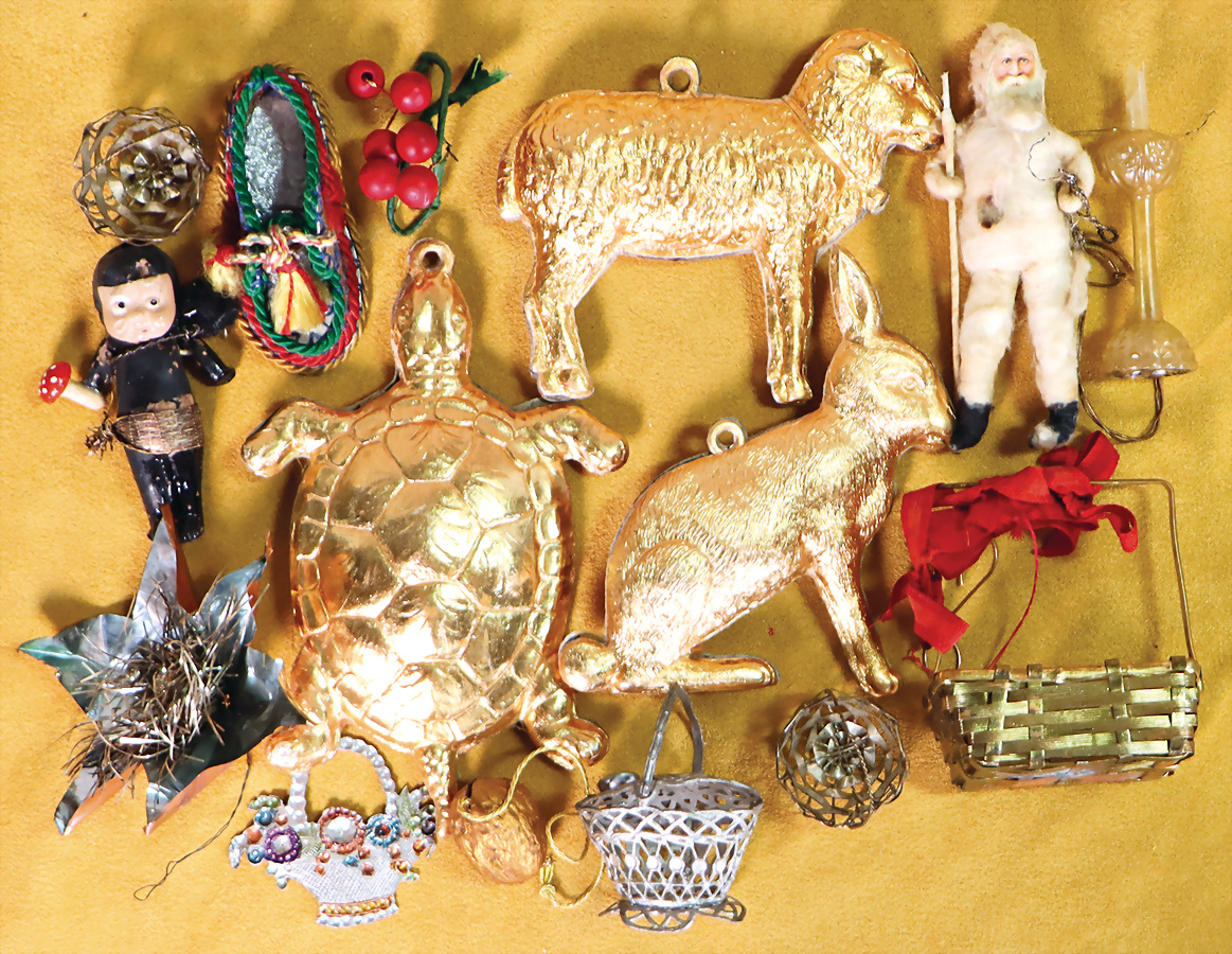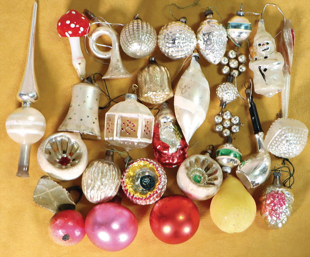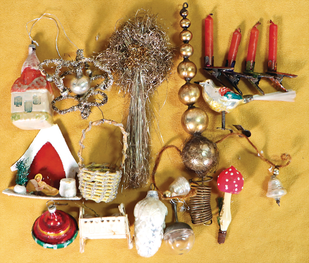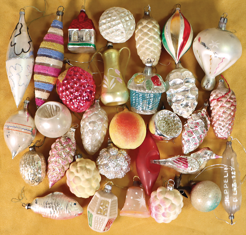 Konv. Christbaumschmuck, 30 Teile, Zapfen, Fisch, Laterne, Häuschen, Kanne, kl. Zeppelin, Reflektorkugeln, Korb, Früchte, "Spielzeugmuseum Graz"