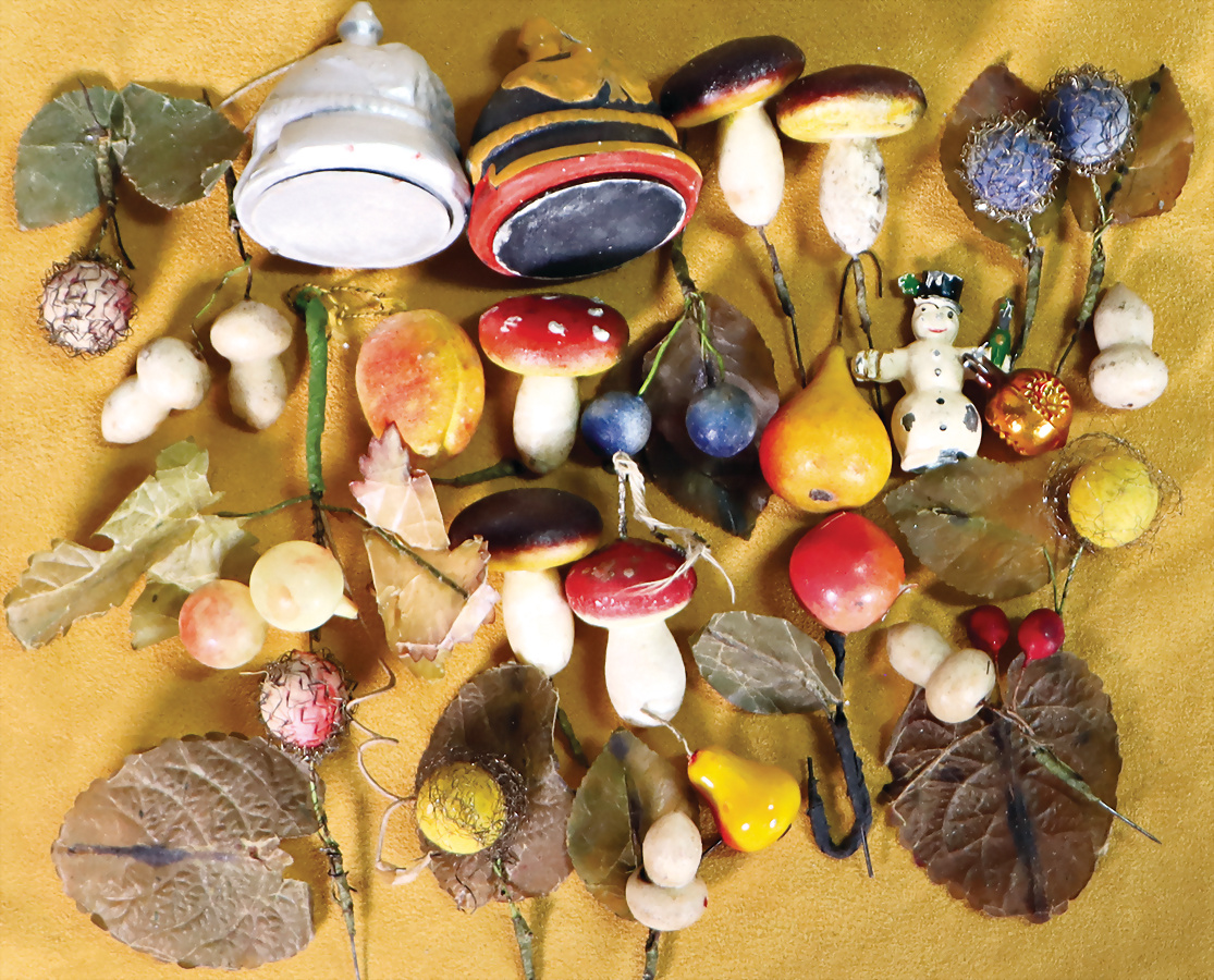 Christbaumschmuck, Watte, Pilze, Früchte, dazu 2 kl. Candy-Container in Helmform, Masse, "Spielzeugmuseum Graz"