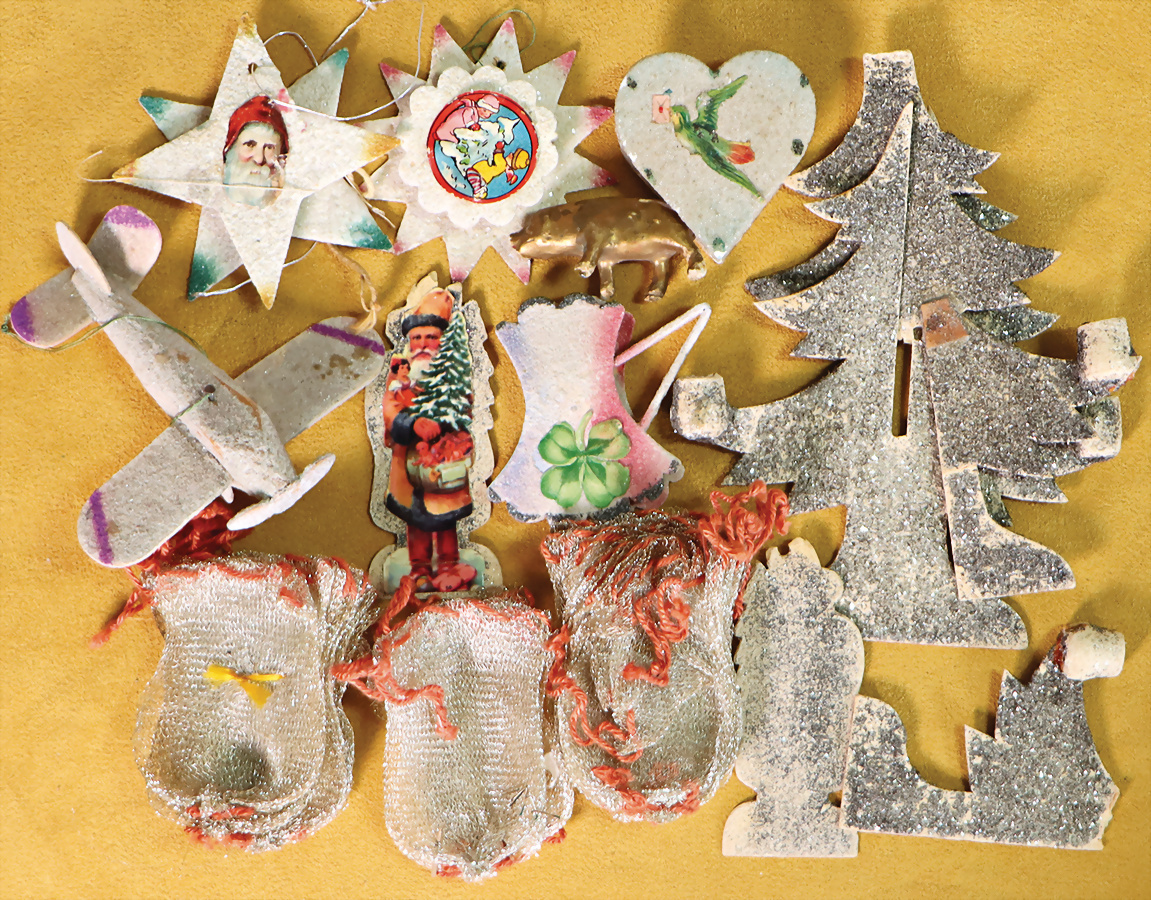 Konv. Christbaumschmuck, Pappe mit Glasglimmer, Flugzeug, Herz, Stern, Weihnachtsmann mit Baum, Aufsteller fehlt, 1 Baum, 1 Seite gebrochen, einige Candy-Container, "Spielzeugmuseum Graz"