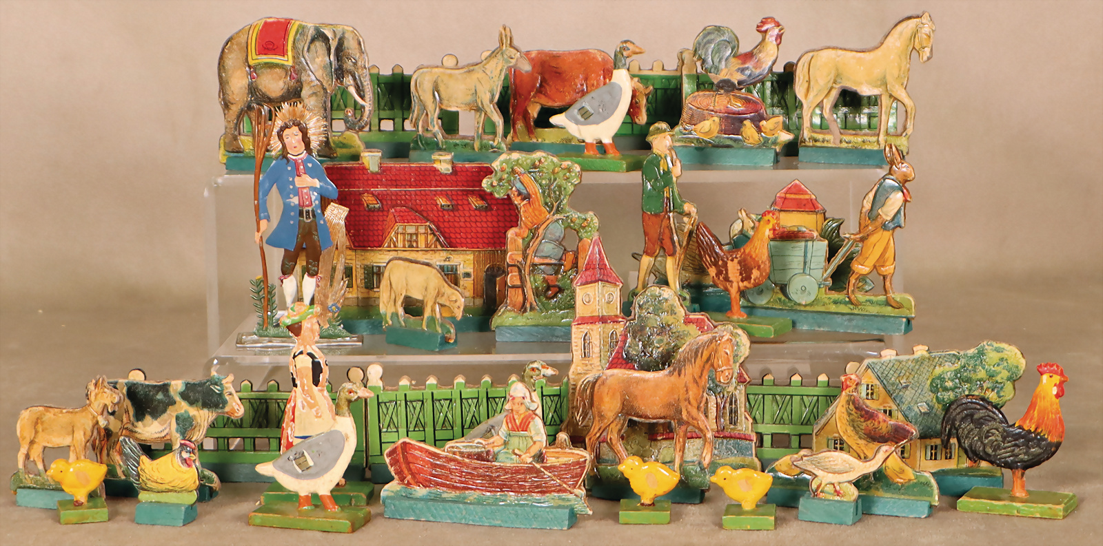 Aufstellfiguren, Pappe, lithografiert, Gebäude, Tiere, Zaunteile, Menschen, H: 7,5 cm, "Spielzeugmuseum Graz"