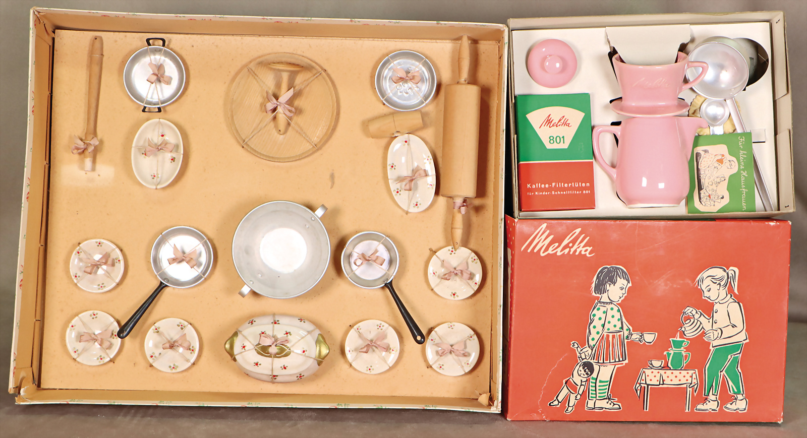 Konv. Melitta, Filterkaffee, Kinder-Set, im Orig.-Kart., dazu 1 Speise-Service, mit Aluminium-Geschirr, 30er-50er Jahre, Teller, D: 5 cm, "Spielzeugmuseum Graz"