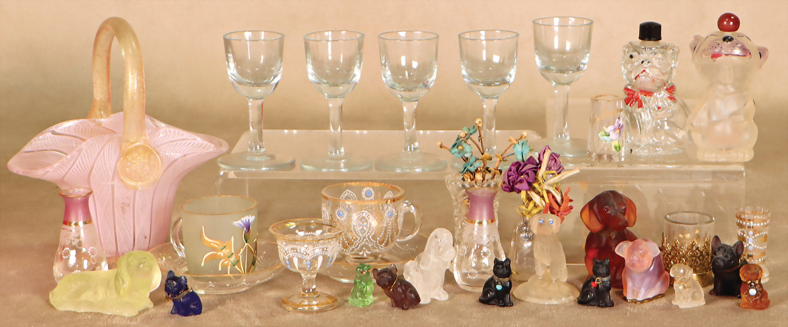 Konv. Glasteile, Hunde, Kelche, Tassen, Teller, 1 Glaskorb, H: 13,5 cm, meist guter Zust., "Spielzeugmuseum Graz"