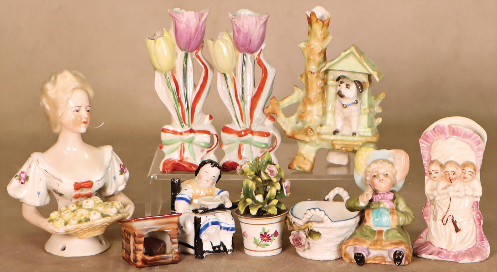 Konv. Porzellan, Vasen, Kind mit Blumenkorb, Blätter bestoßen, kl. Hundehütte, Kind im Hochstuhl, Dame mit Blumenkorb, 12,5 cm , "Spielzeugmuseum Graz"