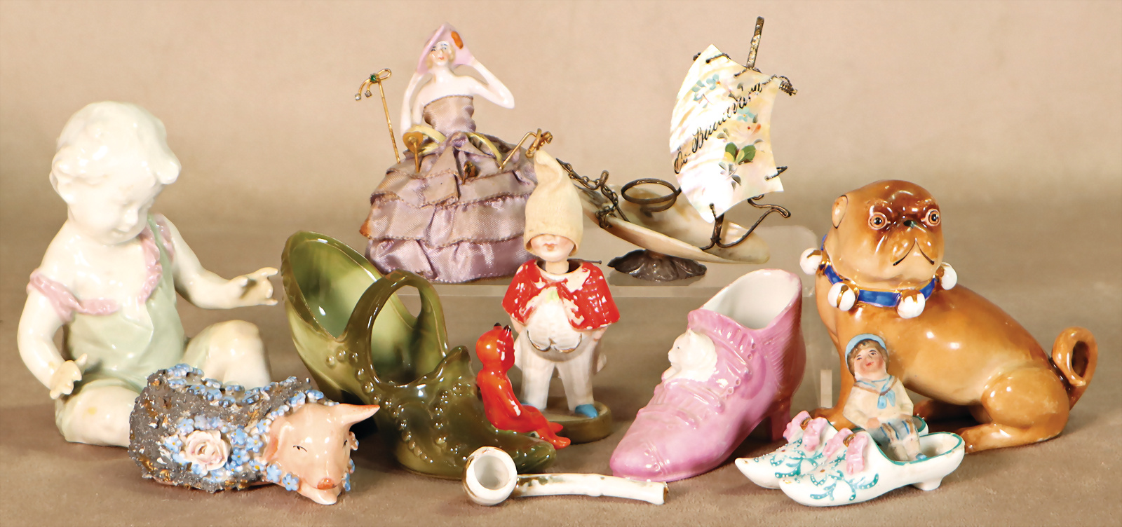 Konv. Porzellan, Bully, H: 9,5 cm, Junge, sitzend, Schuh mit Teufelchen, Schuh mit Katze, Schuhpaare, Nadelkissen, Wackelkopf, Funktion defekt, kl. Boot, Schwein , "Spielzeugmuseum Graz"