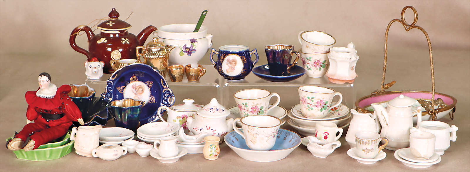 Gr. Konv. Puppengeschirr, meist Porzellan, 1 Porzellan-Schale, mit Henkel, H: 15,5 cm, meist guter Zust., teilw. kl. Ecken angeschlagen, "Spielzeugmuseum Graz"