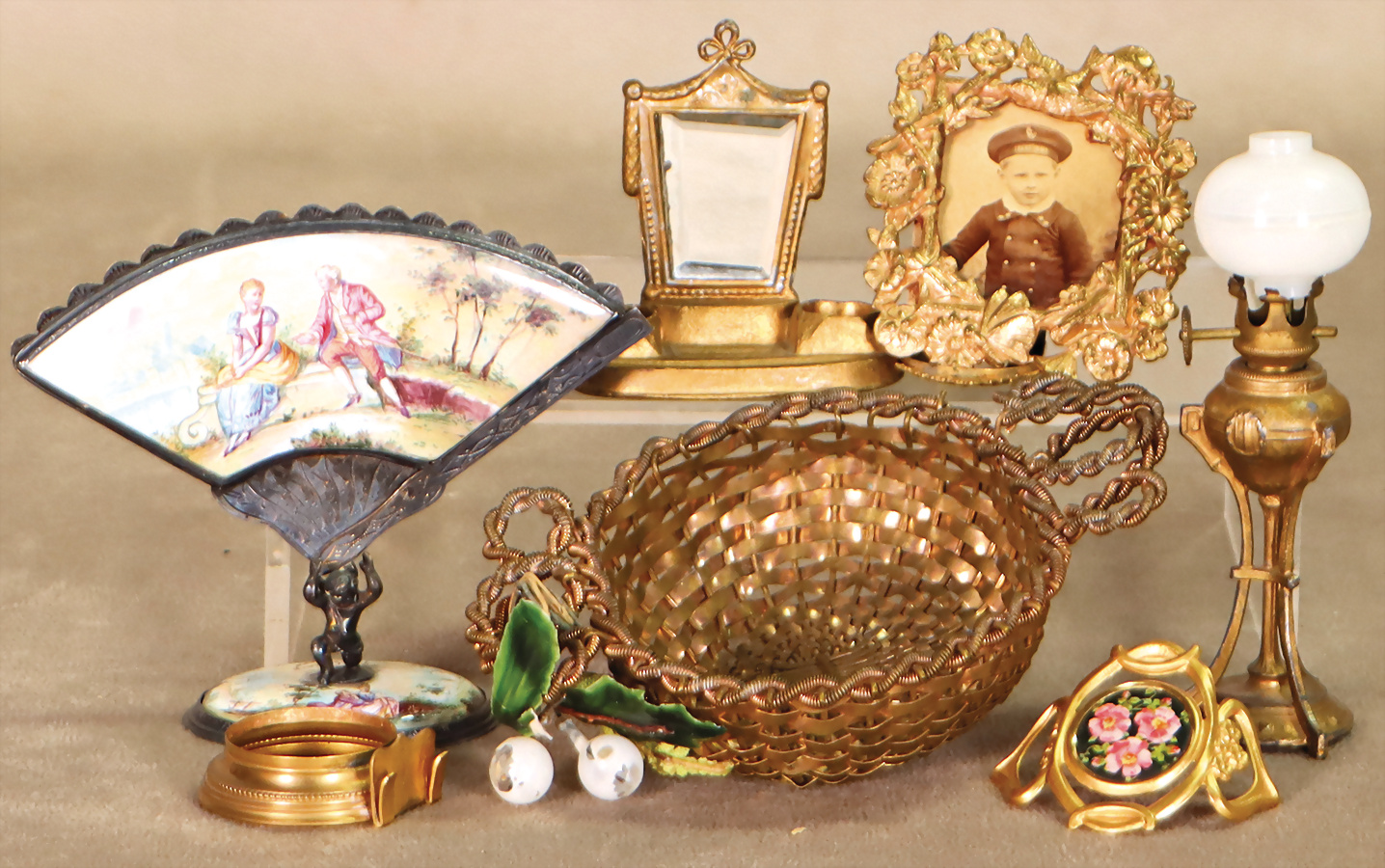 Konv. Puppenstuben-Ausschmückungsteile, Spiegel mit Tintenfass, ohne Einsatz, 6 cm, Fächer mit Figur, emailliertes Bild, Zinn-Lampe, Kleinteile, "Spielzeugmuseum Graz"