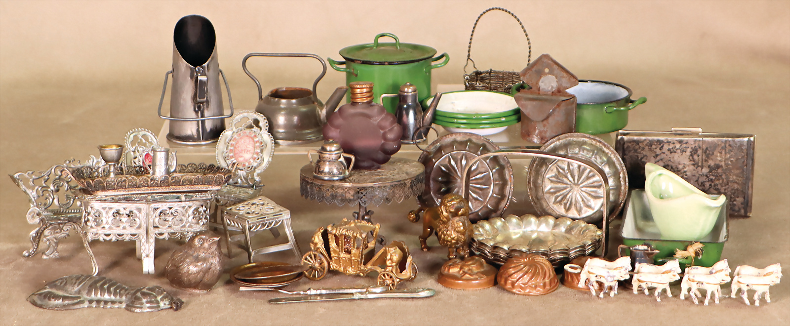 Küchen- u. Puppenstuben-Zubehör, Blech, Formen, Töpfe, Zinn-Sitzgruppe, Tisch, Emaille-Geschirr, "Spielzeugmuseum Graz"