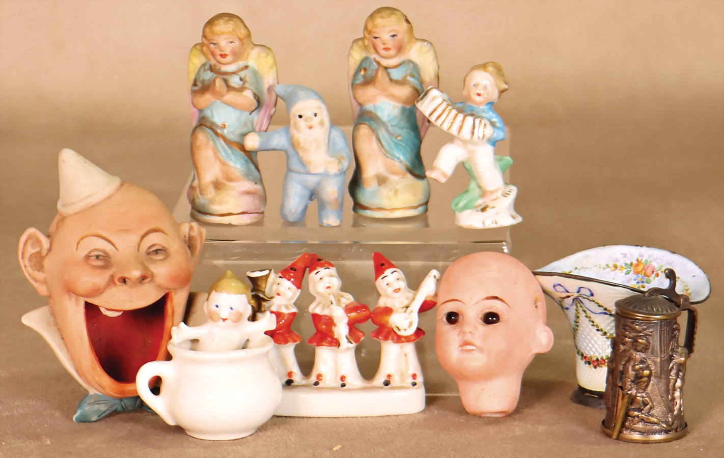 Porzellan-Clowns-Kopf, 8,5 cm, einige Figuren, kl. Vase, Fingerhut, Kelch als Maßband, mit Fingerhut, kl. Puppenkopf, "Spielzeugmuseum Graz"