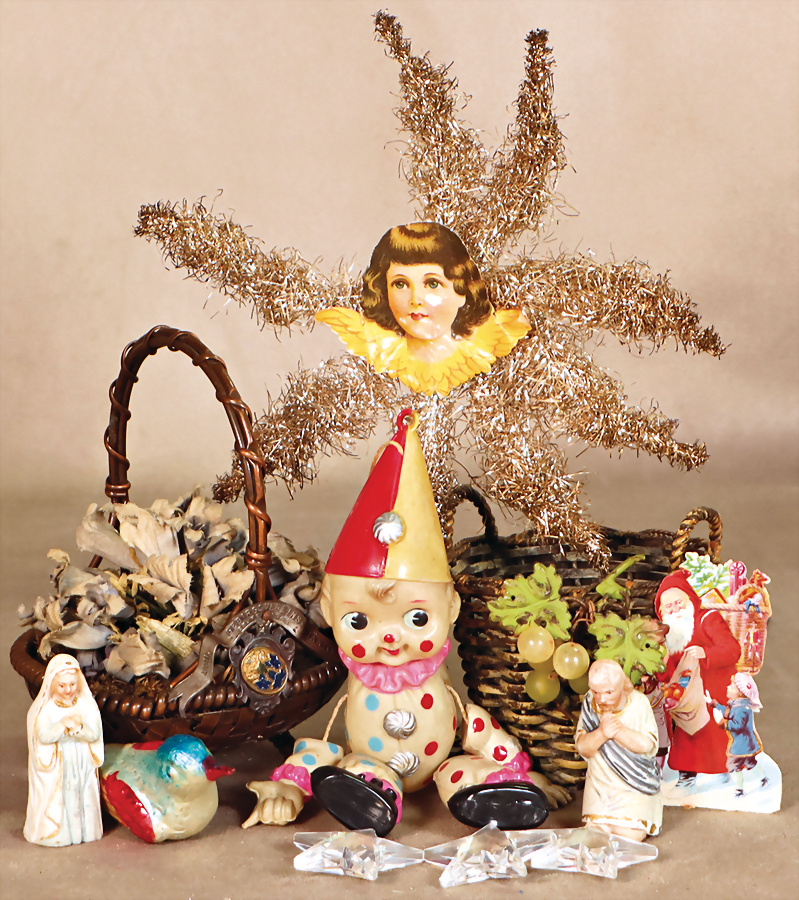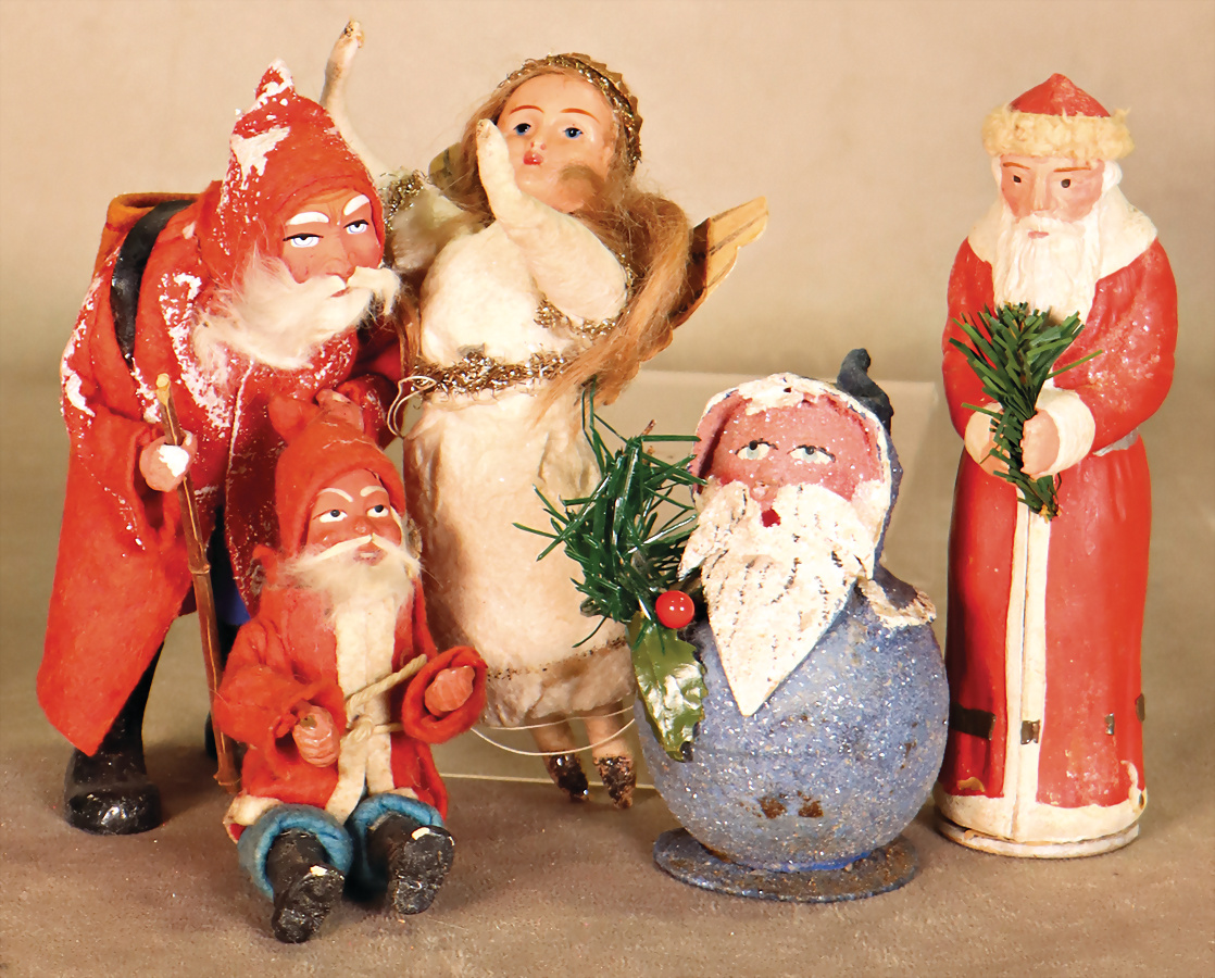 Konv. Weihnachtsmänner, Candy-Container, 15,5 cm, Weihnachtsmann mit Kiepe, Masse, 16 cm, kl. Weihnachtsmann sitzend, Masse, 1 Watteengel, Celluloid-Gesicht, 1 Weihnachtsmann, Glas, Glimmer, Papiermaché, Sockel lose, „Spielzeugmuseum Graz“