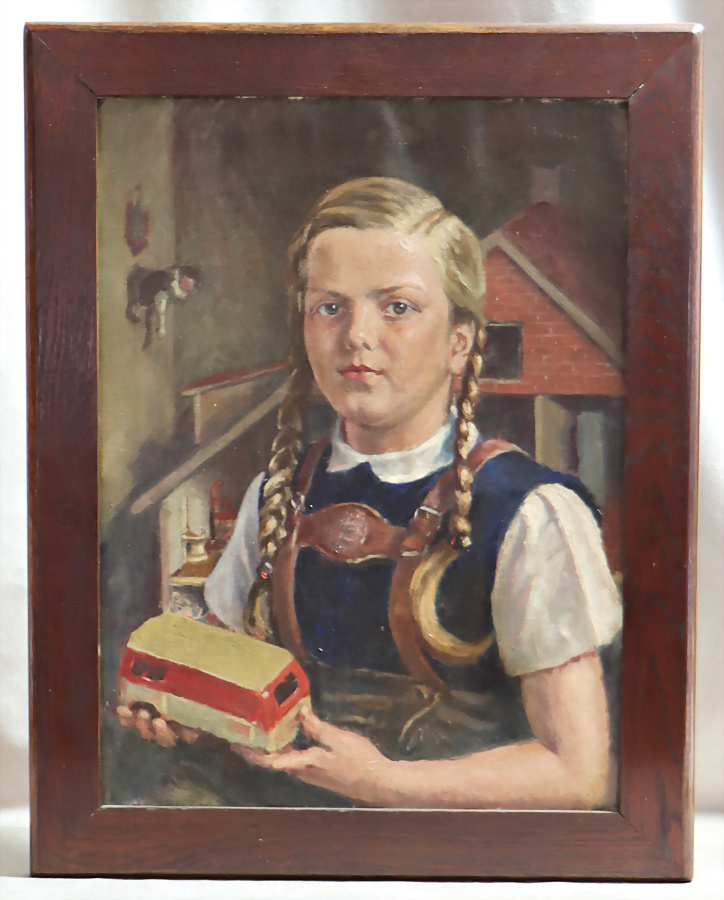 Öl auf Leinwand, Bayrisches Kind mit Blechspielzeug, Innenmaß 59,5x44 cm, wohl 50er Jahre, "Spielzeugmuseum Graz"
