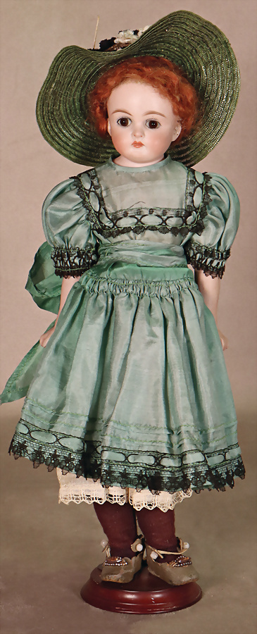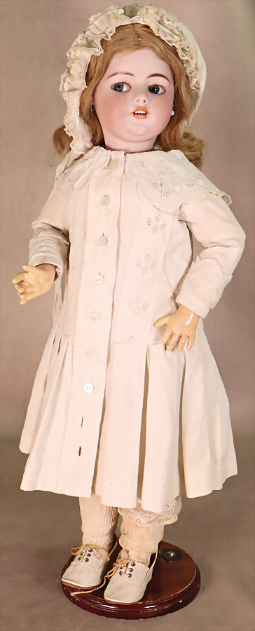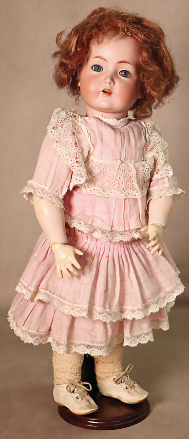 1039 DEP, roter Stempel, 56 cm, blaue Schelmenaugen, off. Mund, oben Zähne, Kinngrübchen, Masse-Stehkörper mit Halsdrehmechanik, Kusshand defekt, alte Echthaar-Perücke, alte Kleidung u. Schuhe, „Spielzeugmuseum Graz“