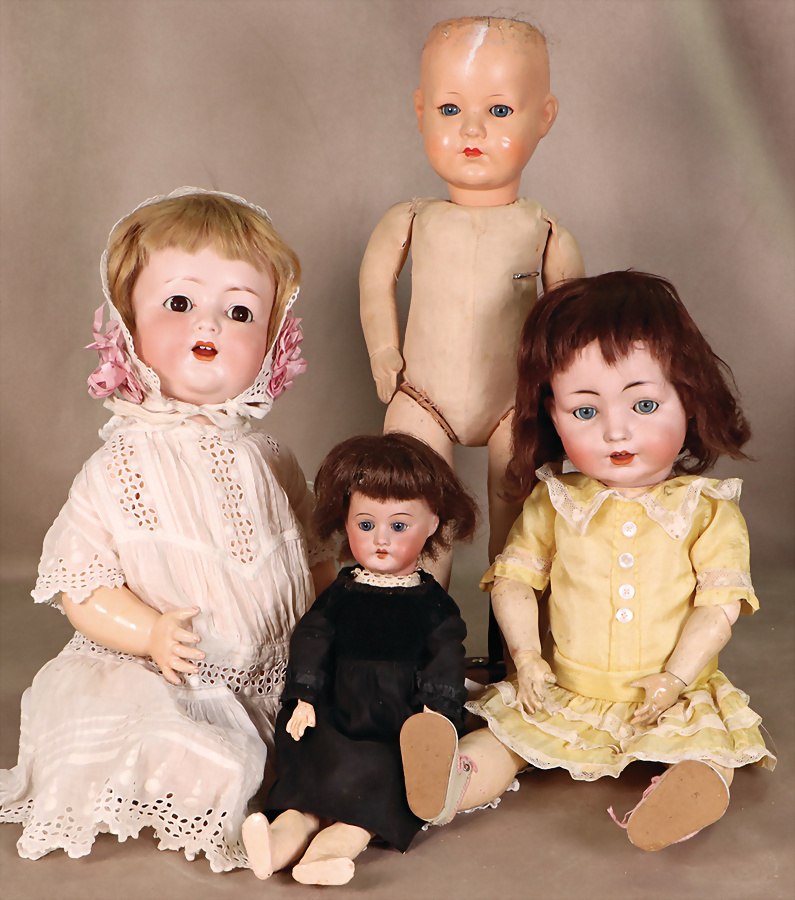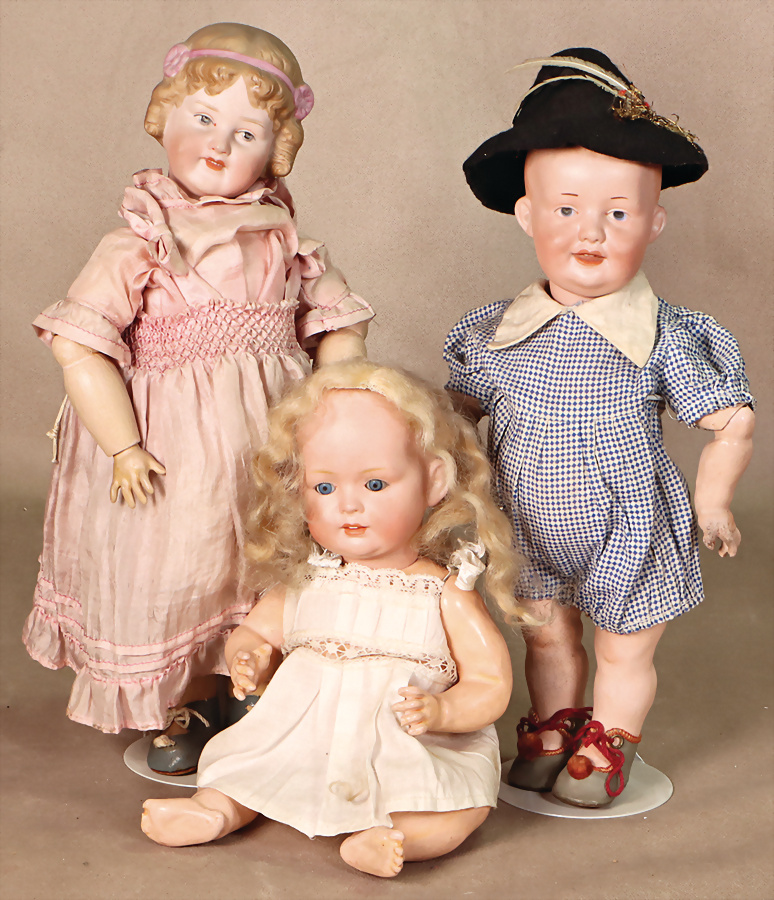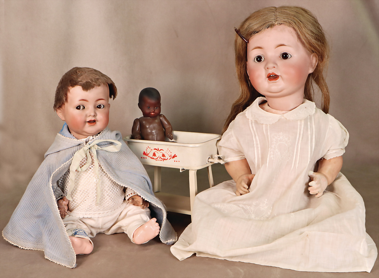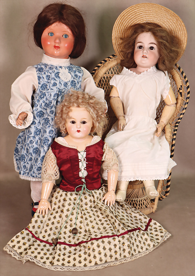 Konv. Puppen, ARMAND MARSEILLE, 390-N, 52 cm, Kurbelkopf, blaue Schlafaugen, off. Mund, Zähne u. Zunge, alte Echthaar-Perücke, Gliederkörper, 1 Finger fehlt, Körper bespielt, Porzellankopf-Puppe, gem. 410, 41 cm, Kurbelkopf, blaue Schlafaugen, off. Mund, oben u. unten Zähne, einfacher Gliederkörper, mit festen Handgelenken, Porzellankopf-Puppe, gem. R2A 1909 DEP, kl. Brandlinie am Kopfrand, ohne Perücke, Schlafaugen, off. Mund, oben Zähne, Gliederkörper, 1 Arm fehlt, 2 Finger der anderen Hand fehlen, Masse-Abplatzer am Körper, „Spielzeugmuseum Graz“
