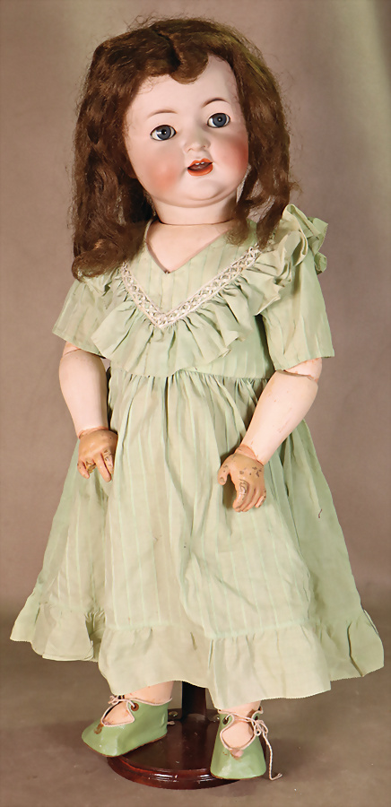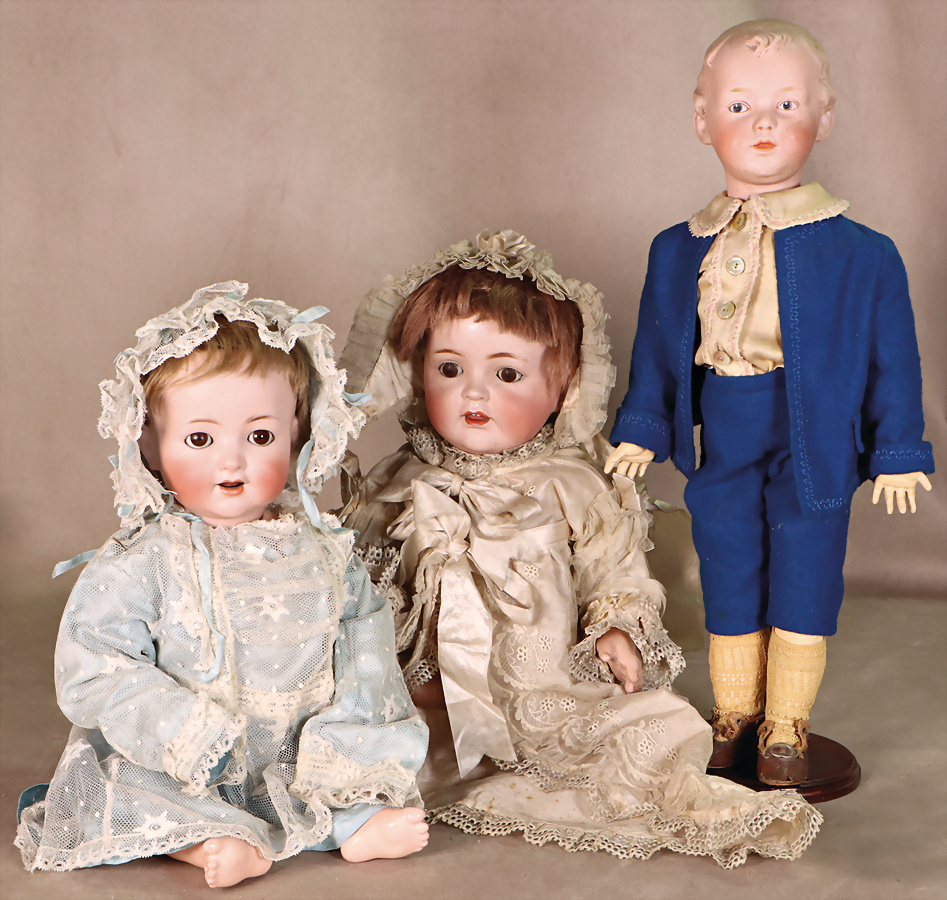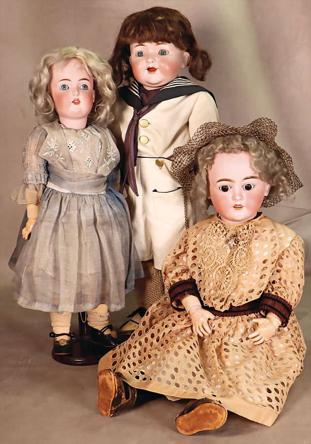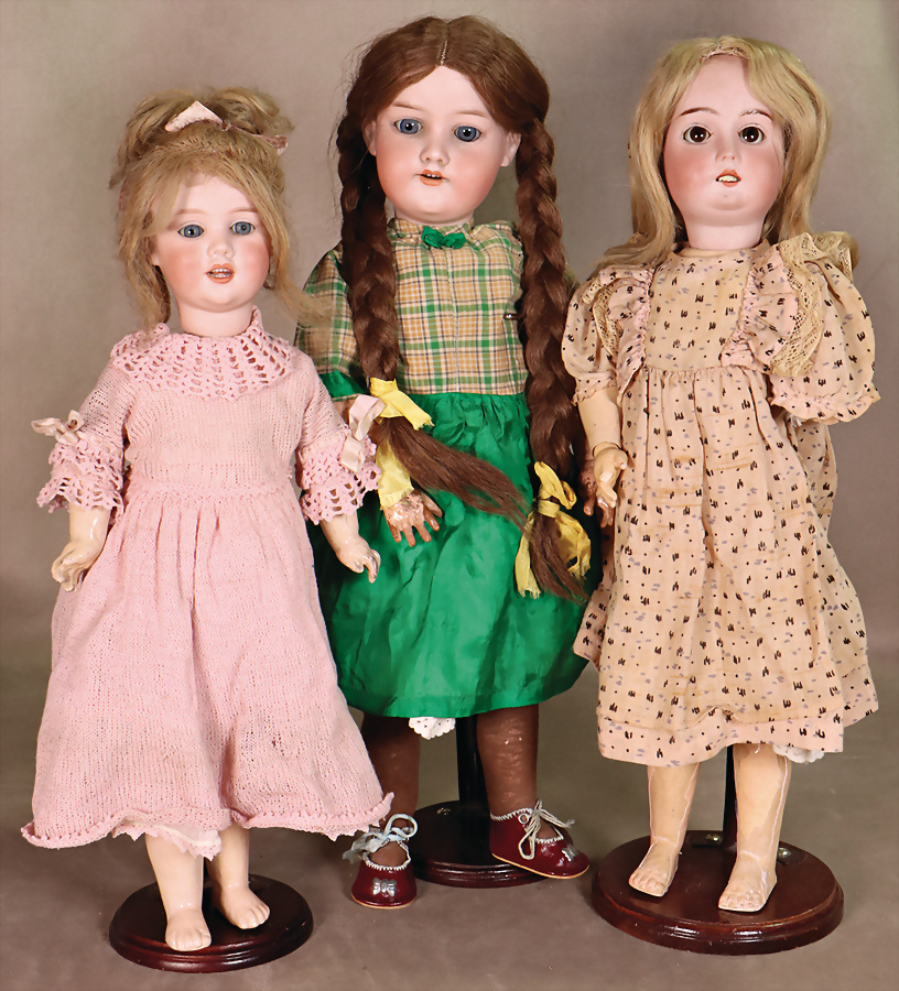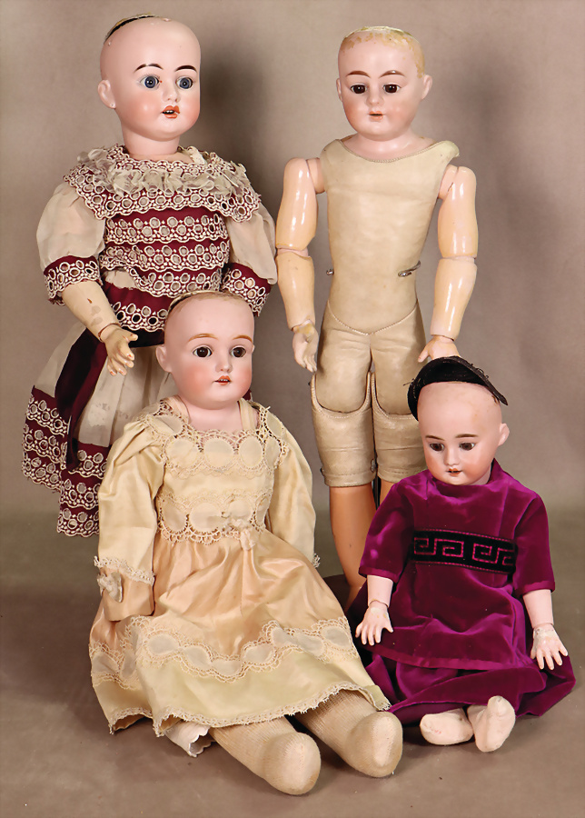 Konv. Puppen, ARMAND MARSEILLE, 390-N, 52 cm, Kurbelkopf, blaue Schlafaugen, off. Mund, Zähne u. Zunge, alte Echthaar-Perücke, Gliederkörper, 1 Finger fehlt, Körper bespielt, Porzellankopf-Puppe, gem. 410, 41 cm, Kurbelkopf, blaue Schlafaugen, off. Mund, oben u. unten Zähne, einfacher Gliederkörper, mit festen Handgelenken, Porzellankopf-Puppe, gem. R2A 1909 DEP, kl. Brandlinie am Kopfrand, ohne Perücke, Schlafaugen, off. Mund, oben Zähne, Gliederkörper, 1 Arm fehlt, 2 Finger der anderen Hand fehlen, Masse-Abplatzer am Körper, „Spielzeugmuseum Graz“