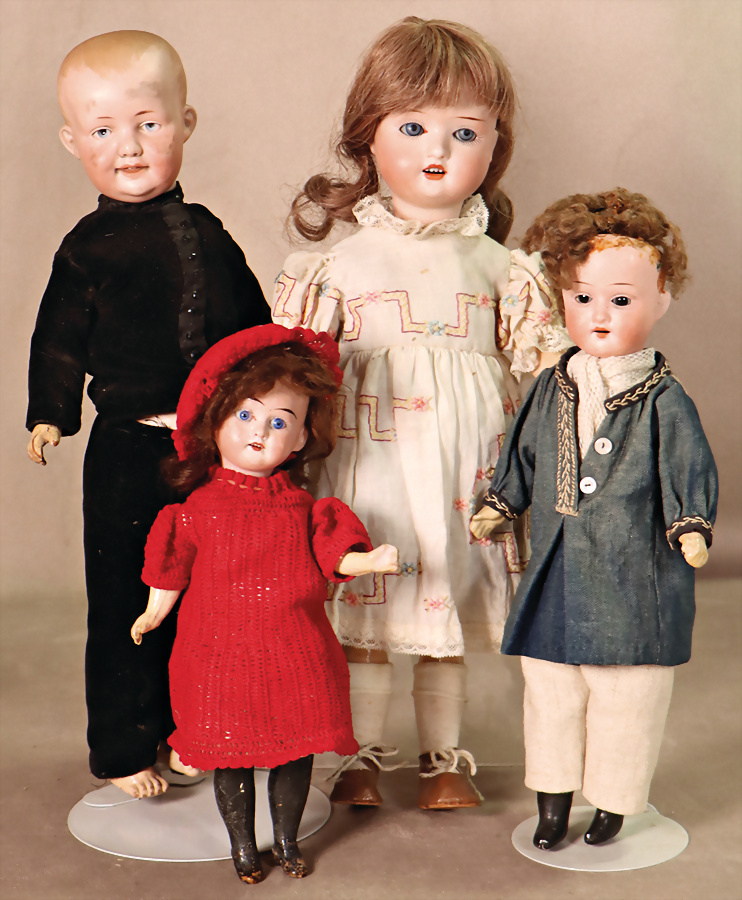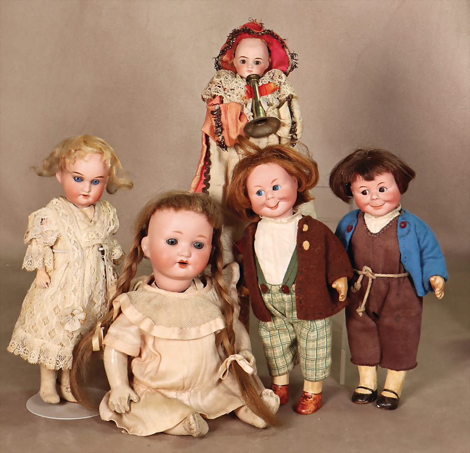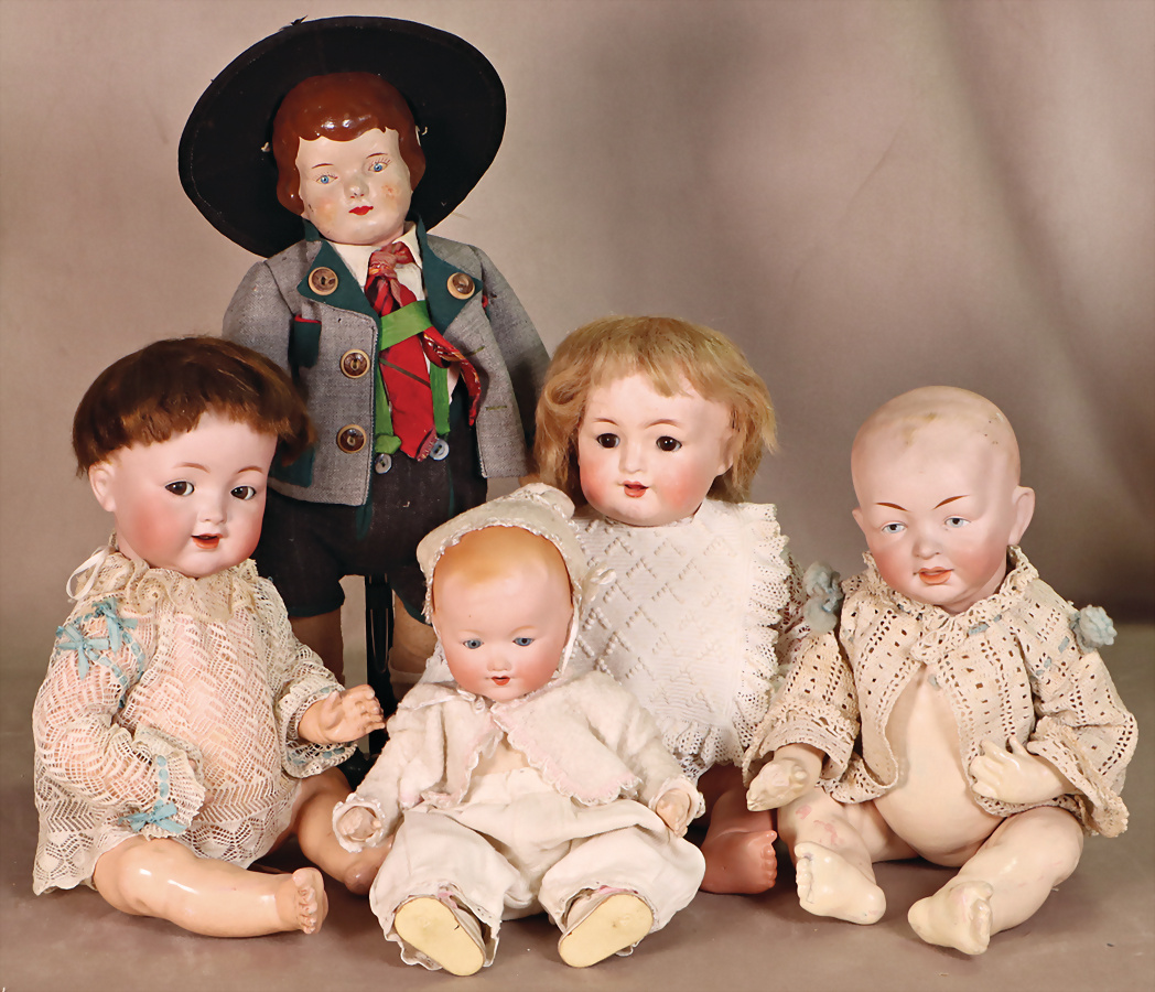 Konv. Puppen, kl. Porzellankopf-Puppe, ARMAND MARSEILLE, 1894, 21 cm, fest einges. Glasaugen, Masse-Stehkörper, SCHOENAU & HOFFMEISTER, 1909, 28 cm, Kurbelkopf, braune Schlafaugen, Masse-Stehkörper, Gummis locker, ARMAND MARSEILLE; 560, DRGM, Charakter-Junge, Vollkopf, Kurbelkopf, Intaglio-Augen, off./geschl. Mund, einfacher Masse-Stehkörper, Verfärbungen im Gesicht, SCHOENAU & HOFFMEISTER, Porzellankopf-Puppe, 34 cm Kurbelkopf, Schlafaugen, off. Mund, Zähne, Riss am Kopf, Stehkörper, „Spielzeugmuseum Graz“