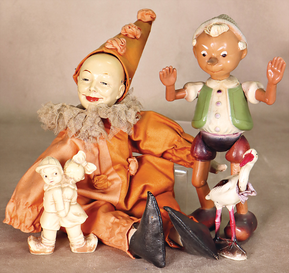 SoR, Einbindekopf-Puppe, Harlekin, 37 cm, Stoffkörper, 1 Hand, fehlt, Celluloid, Pinocchio, ungem., Rasse-Celluloid-Junge u. -Mädchen, STORCH, „Spielzeugmuseum Graz“