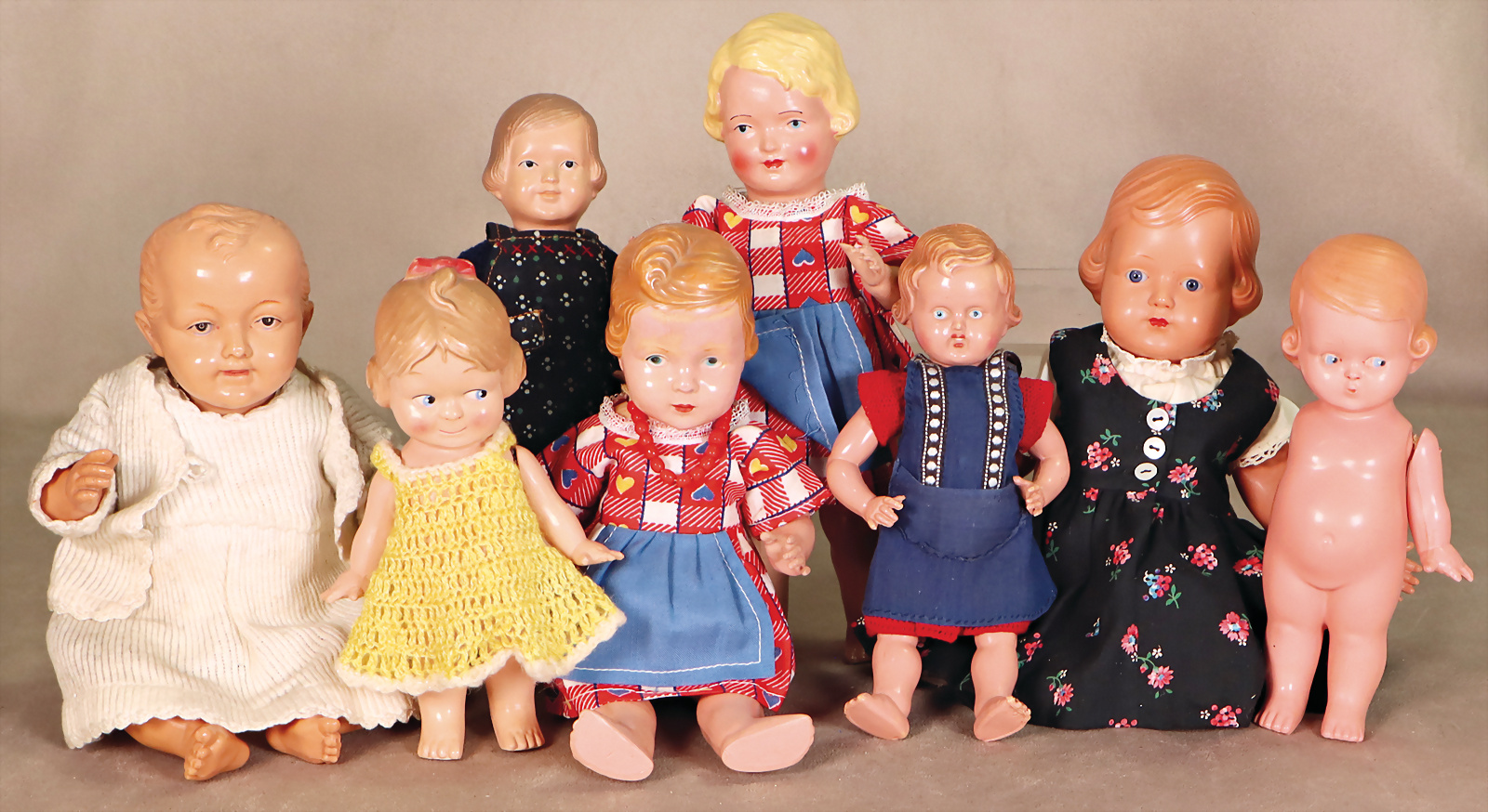 Konv. Celluloid-Puppen, MINERVA, Charakter-Baby im Wickelkissen, CELLBA, Mädchen, Beine liegen lose bei, 4 kl. Celluloid-Puppen, untersch. Hersteller, 1 Fuß weggebrochen, 2 kl. Celluloid-Kewpies, meist guter Zust. , „Spielzeugmuseum Graz“