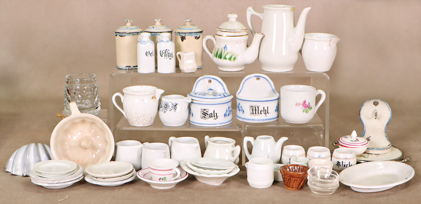 Konv. Puppenküchenteile, Porzellan, Mezte, Essig- u. Öl-Karaffe, Krüge, dazu 2 Gewürzdosen, Blech, „Spielzeugmuseum Graz“
