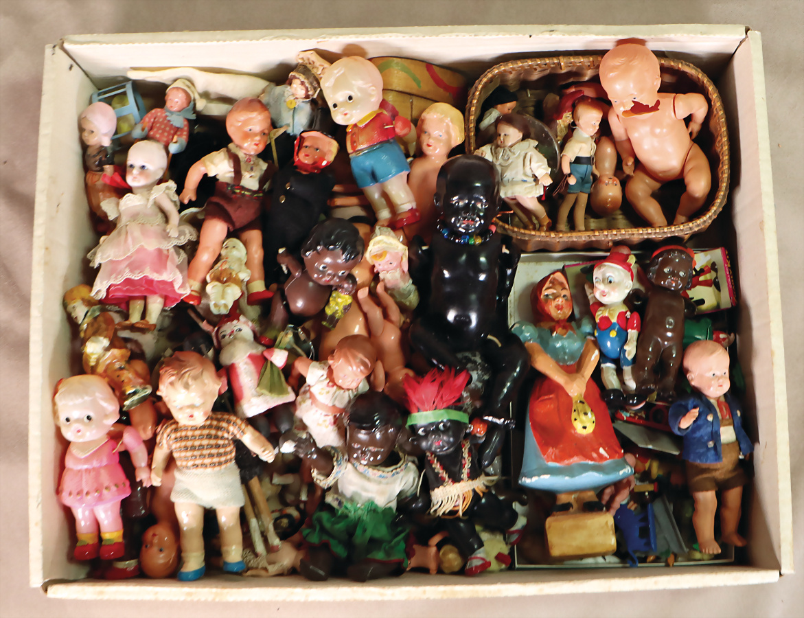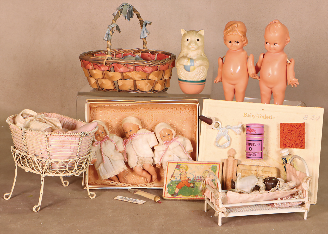 Konv. kl. Puppen, Zubehör, Puppenbett mit farbigem Celluloid-Kewpie, Bett 11 cm, Korb mit Celluloid-Kind, 2 Celluloid-Kewpies, Bett mit Ganzbiskuit-Kind, Stehauffigur, Katze, Baby-Toilette, 3 Celluloid-Kinder, „Spielzeugmuseum Graz“