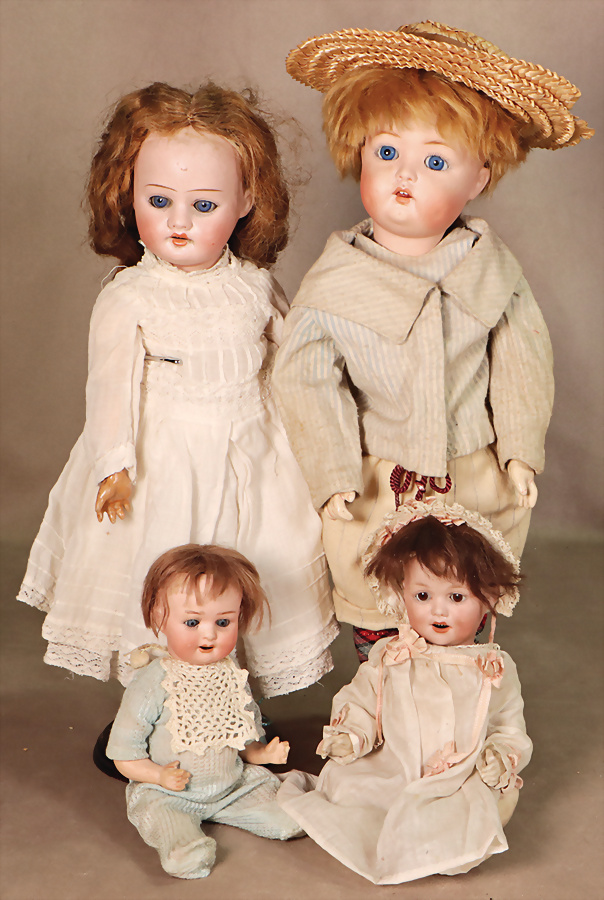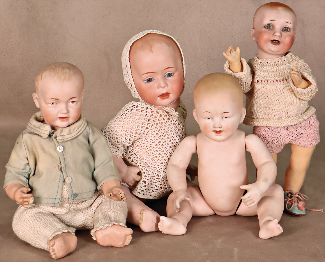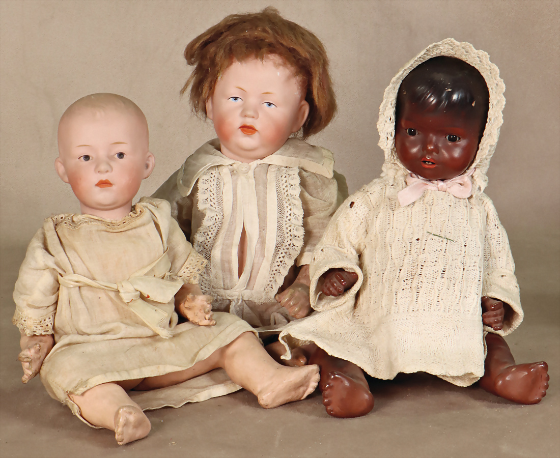 Konv. Puppen, KLEY & HAHN, 526, Charakter-Baby, Vollkopf, 24 cm, Sitzbaby-Körper, Finger an 1 Hand fehlen, SWANTJE & CO, gem. D.V 3 grüner Stempel, Vollkopf, fest einges. Blaue Glasaugen, off./geschl. Mund, Sitzbaby-Körper, Körper bespielt, Gummis locker, ARMAND MARSEILLE, 328, Charakter-Baby, Vollkopf, nachtr. fest einges. blaue Glasaugen, off. Mund, oben Zähne, Masse-Stehkörper, Gummis locker, 1 Ganzbiskuit-Puppe, Alter? , „Spielzeugmuseum Graz“