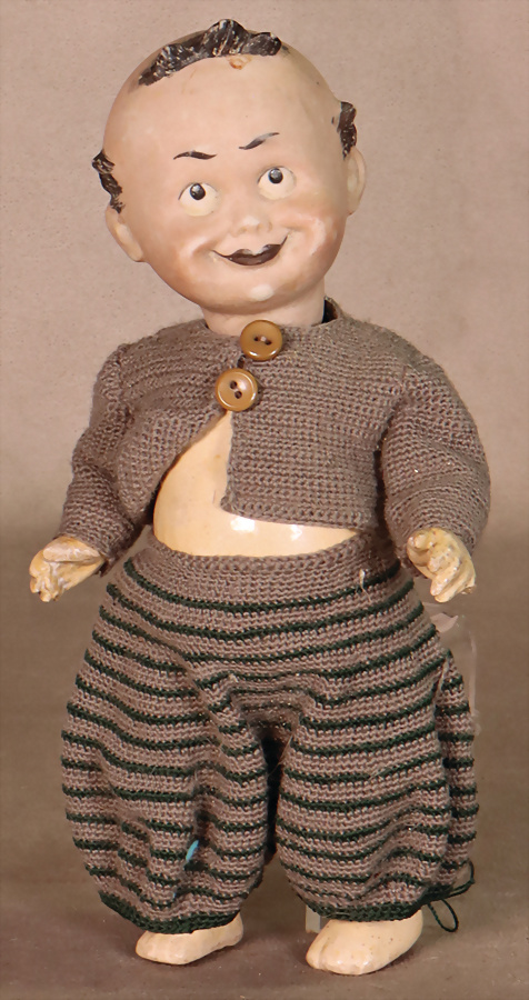 Außergewöhnliche Porzellankopf-Puppe, Vollkopf, gem. R72-A, 20 cm, Porzellan-Vollkopf, anmodell. Haare, gemalte Augen, geschl. Mund, Masse-Stehkörper mit dickem Bauch, „Spielzeugmuseum Graz“